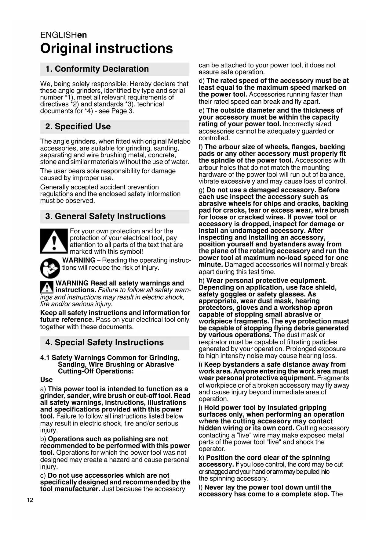 Original instructions We, being solely responsible: Hereby declare that these angle grinders, identified by type and serial number *1), meet all relevant requirements of directives *2) and standards *3). technical documents for *4) - see Page 3. The angle grinders, when fitted with original Metabo accessories, are suitable for grinding, sanding, separating and wire brushing metal, concrete, stone and similar materials without the use of water. The user bears sole responsibility for damage caused by improper use. Generally accepted accident prevention regulations and the enclosed safety information must be observed. For your own protection and for the protection of your electrical tool, pay attention to all parts of the text that are marked with this symbol! WARNING – Reading the operating instruc- tions will reduce the risk of injury. WARNING Read all safety warnings and instructions. Failure to follow all safety warn- ings and instructions may result in electric shock, fire and/or serious injury. Keep all safety instructions and information for future reference. Pass on your electrical tool only together with these documents.