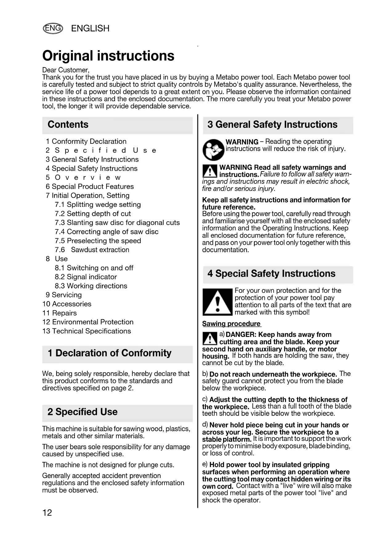 Hold power tool by insulated gripping surfaces when performing an operation where the cutting tool may contact hidden wiring or its own cord. Contact with a "live" wire will also make exposed metal parts of the power tool "live" and shock the operator. Original instructions Dear Customer, Thank you for the trust you have placed in us by buying a Metabo power tool. Each Metabo power tool is carefully tested and subject to strict quality controls by Metabo's quality assurance. Nevertheless, the service life of a power tool depends to a great extent on you. Please observe the information contained in these instructions and the enclosed documentation. The more carefully you treat your Metabo power tool, the longer it will provide dependable service. Contents 1 Declaration of Conformity 2 Specified Use 3 General Safety Instructions 4 Special Safety Instructions 17024962_1008_ KS 54 KS 54 SP KSE 55 Plus.book Seite 12 Dienstag, 28. Oktober 2008 9:46 09ENGLISH