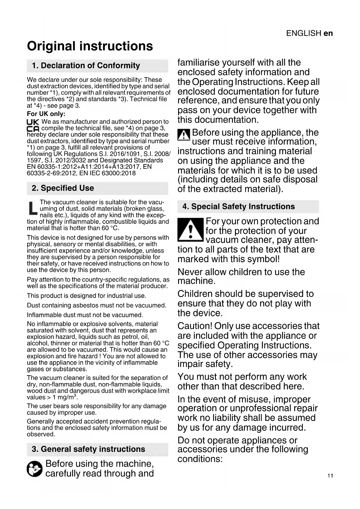 Original instructions We declare under our sole responsibility: These dust extraction devices, identified by type and serial number *1), comply with all relevant requirements of the directives *2) and standards *3). Technical file at *4) - see page 3. For UK only: We as manufacturer and authorized person to compile the technical file, see *4) on page 3, hereby declare under sole responsibility that these dust extractors, identified by type and serial number *1) on page 3, fulfill all relevant provisions of following UK Regulations S.I. 2016/1091, S.I. 2008/ 1597, S.I. 2012/3032 and Designated Standards EN 60335-1:2012+A11:2014+A13:2017, EN