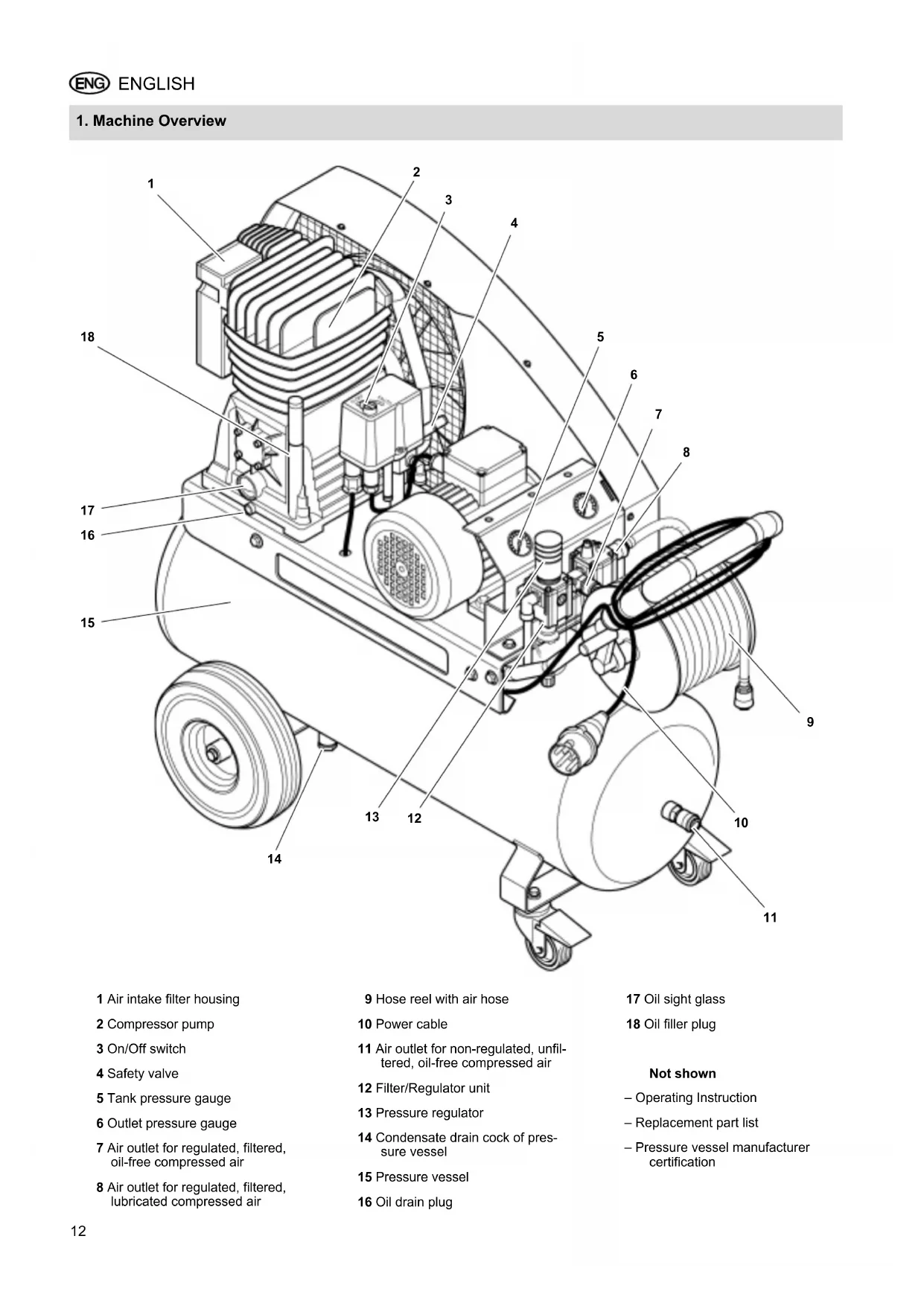 1 Air intake filter housing 2 Compressor pump 3 On/Off switch 4 Safety valve 5 Tank pressure gauge 6 Outlet pressure gauge 7 Air outlet for regulated, filtered, oil-free compressed air 8 Air outlet for regulated, filtered, lubricated compressed air 9 Hose reel with air hose 10 Power cable 11 Air outlet for non-regulated, unfil- tered, oil-free compressed air 12 Filter/Regulator unit 13 Pressure regulator 14 Condensate drain cock of pres- sure vessel 15 Pressure vessel 16 Oil drain plug 17 Oil sight glass 18 Oil filler plug Not shown – Operating Instruction – Replacement part list – Pressure vessel manufacturer certification Xk0013e2.fm Operating Instruction ENGLISH13 ENGLISH