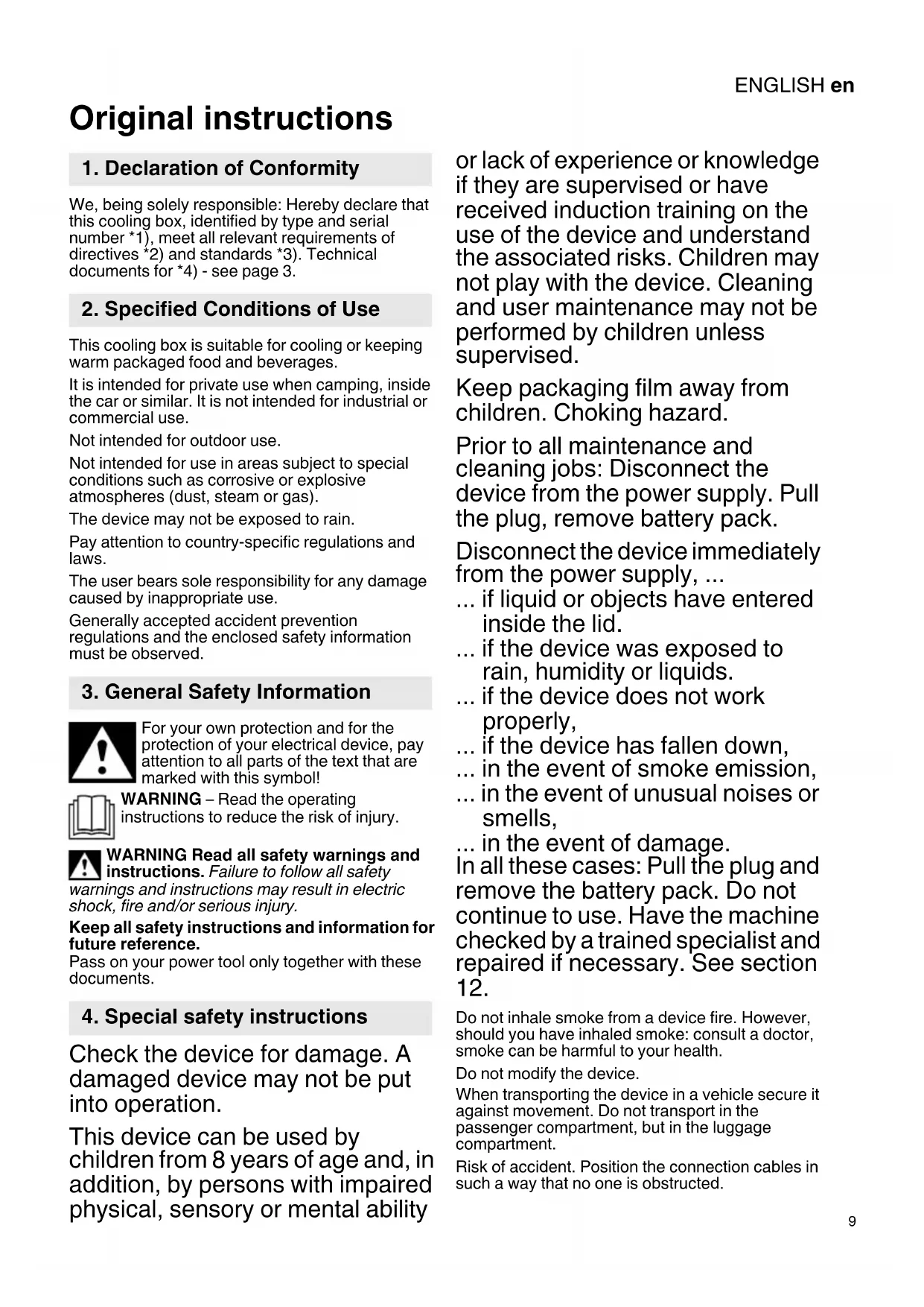 Original instructions We, being solely responsible: Hereby declare that this cooling box, identified by type and serial number *1), meet all relevant requirements of directives *2) and standards *3). Technical documents for *4) - see page 3. This cooling box is suitable for cooling or keeping warm packaged food and beverages. It is intended for private use when camping, inside the car or similar. It is not intended for industrial or commercial use. Not intended for outdoor use. Not intended for use in areas subject to special conditions such as corrosive or explosive atmospheres (dust, steam or gas). The device may not be exposed to rain. Pay attention to country-specific regulations and laws. The user bears sole responsibility for any damage caused by inappropriate use. Generally accepted accident prevention regulations and the enclosed safety information must be observed. For your own protection and for the protection of your electrical device, pay attention to all parts of the text that are marked with this symbol! WARNING – Read the operating instructions to reduce the risk of injury. WARNING Read all safety warnings and instructions. Failure to follow all safety warnings and instructions may result in electric shock, fire and/or serious injury. Keep all safety instructions and information for future reference. Pass on your power tool only together with these documents. Check the device for damage. A damaged device may not be put into operation. This device can be used by children from 8 years of age and, in addition, by persons with impaired physical, sensory or mental ability or lack of experience or knowledge if they are supervised or have received induction training on the use of the device and understand the associated risks. Children may not play with the device. Cleaning and user maintenance may not be performed by children unless supervised. Keep packaging film away from children. Choking hazard. Prior to all maintenance and cleaning jobs: Disconnect the device from the power supply. Pull the plug, remove battery pack. Disconnect the device immediately from the power supply, ... ... if liquid or objects have entered inside the lid. ... if the device was exposed to rain, humidity or liquids. ... if the device does not work properly, ... if the device has fallen down, ... in the event of smoke emission, ... in the event of unusual noises or smells, ... in the event of damage. In all these cases: Pull the plug and remove the battery pack. Do not continue to use. Have the machine checked by a trained specialist and repaired if necessary. See section