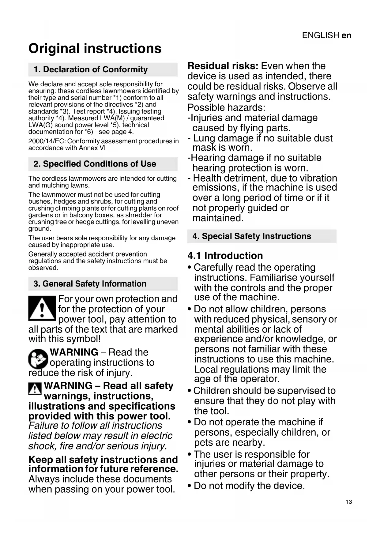 Original instructions We declare and accept sole responsibility for ensuring: these cordless lawnmowers identified by their type and serial number *1) conform to all relevant provisions of the directives *2) and standards *3). Test report *4), Issuing testing authority *4). Measured LWA(M) / guaranteed LWA(G) sound power level *5), technical documentation for *6) - see page 4. 2000/14/EC: Conformity assessment procedures in accordance with Annex VI The cordless lawnmowers are intended for cutting and mulching lawns. The lawnmower must not be used for cutting bushes, hedges and shrubs, for cutting and crushing climbing plants or for cutting plants on roof gardens or in balcony boxes, as shredder for crushing tree or hedge cuttings, for levelling uneven ground. The user bears sole responsibility for any damage caused by inappropriate use. Generally accepted accident prevention regulations and the safety instructions must be observed. For your own protection and for the protection of your power tool, pay attention to all parts of the text that are marked with this symbol! WARNING – Read the operating instructions to reduce the risk of injury. WARNING – Read all safety warnings, instructions, illustrations and specifications provided with this power tool. Failure to follow all instructions listed below may result in electric shock, fire and/or serious injury. Keep all safety instructions and information for future reference. Always include these documents when passing on your power tool. Residual risks: Even when the device is used as intended, there could be residual risks. Observe all safety warnings and instructions. Possible hazards: -Injuries and material damage caused by flying parts. - Lung damage if no suitable dust mask is worn. -Hearing damage if no suitable hearing protection is worn. - Health detriment, due to vibration emissions, if the machine is used over a long period of time or if it not properly guided or maintained.