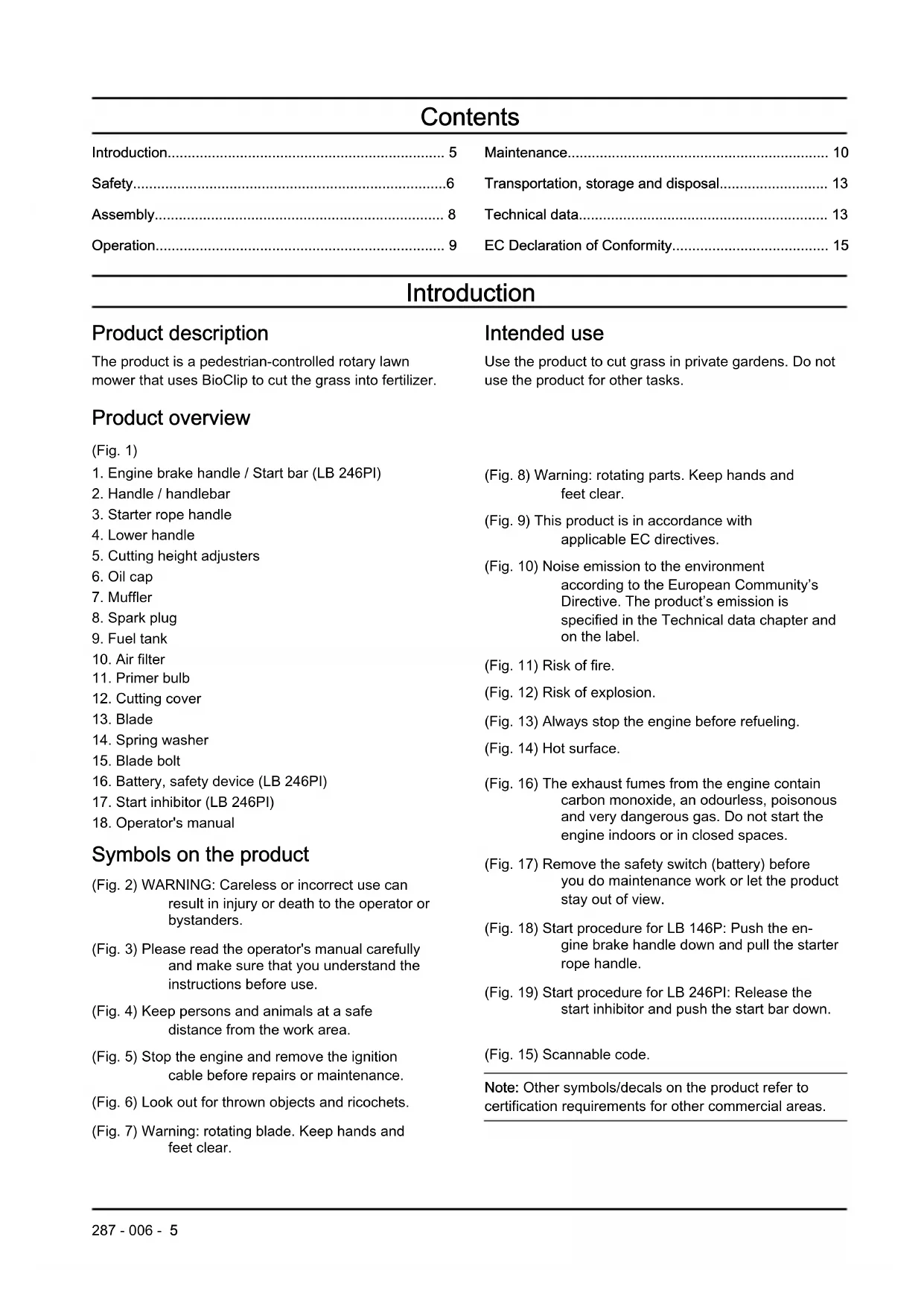 Symbols on the product (Fig. 2) WARNING: Careless or incorrect use can result in injury or death to the operator or bystanders. (Fig. 3) Please read the operator's manual carefully and make sure that you understand the instructions before use. (Fig. 4) Keep persons and animals at a safe distance from the work area. (Fig. 5) Stop the engine and remove the ignition cable before repairs or maintenance. (Fig. 6) Look out for thrown objects and ricochets. (Fig. 7) Warning: rotating blade. Keep hands and feet clear. (Fig. 8) Warning: rotating parts. Keep hands and feet clear. (Fig. 9) This product is in accordance with applicable EC directives. (Fig. 10) Noise emission to the environment according to the European Community’s Directive. The product’s emission is specified in the Technical data chapter and on the label. (Fig. 11) Risk of fire. (Fig. 12) Risk of explosion. (Fig. 13) Always stop the engine before refueling. (Fig. 14) Hot surface. (Fig. 16) The exhaust fumes from the engine contain carbon monoxide, an odourless, poisonous and very dangerous gas. Do not start the engine indoors or in closed spaces. (Fig. 17) Remove the safety switch (battery) before you do maintenance work or let the product stay out of view. (Fig. 18) Start procedure for LB 146P: Push the en- gine brake handle down and pull the starter rope handle. (Fig. 19) Start procedure for LB 246PI: Release the start inhibitor and push the start bar down. (Fig. 15) Scannable code. Note: Other symbols/decals on the product refer to certification requirements for other commercial areas.