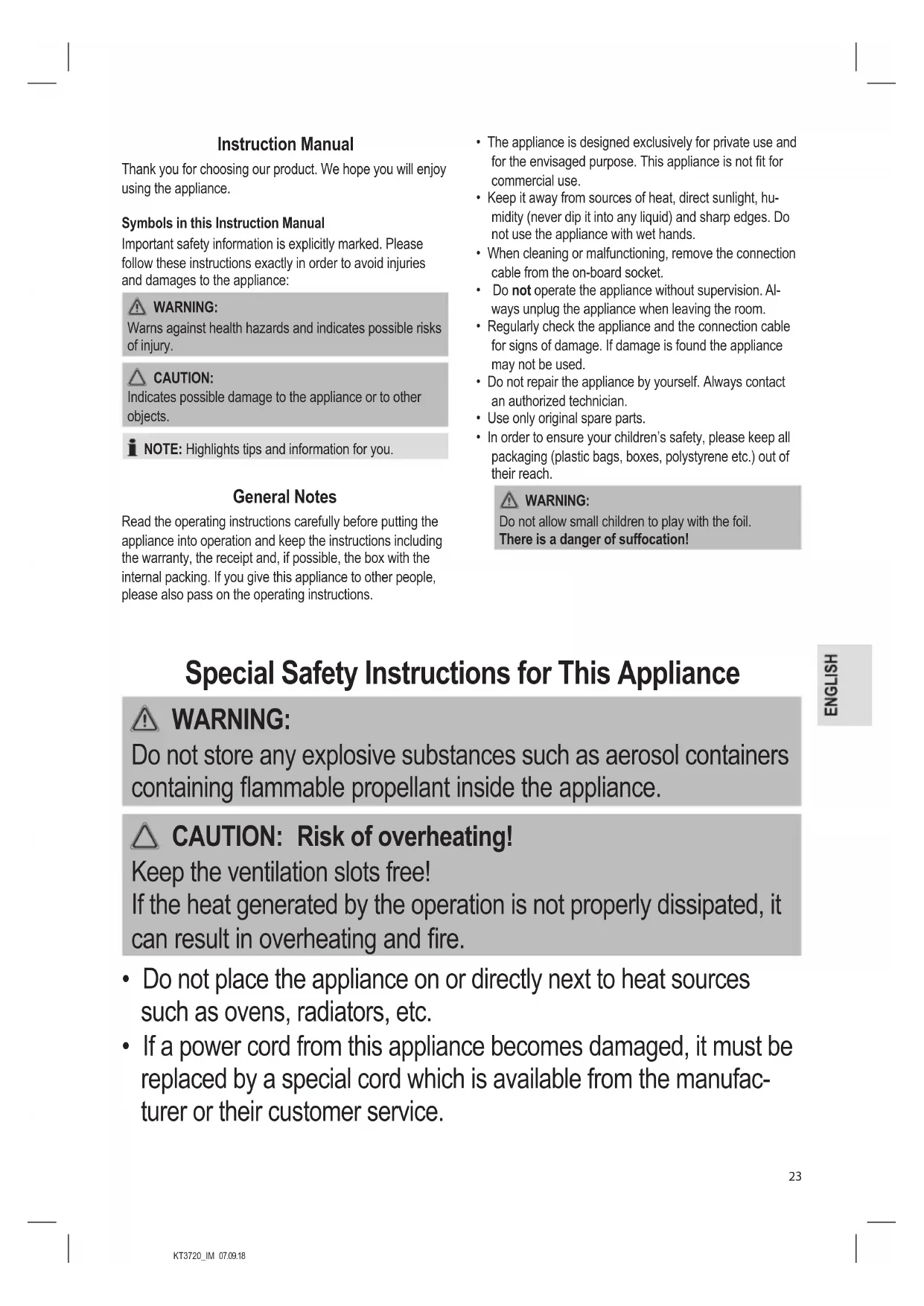 - If a power cord from this appliance becomes damaged, it must be replaced by a special cord which is available from the manufac- turer or their customer service.KT3720_IM 07.09.18
