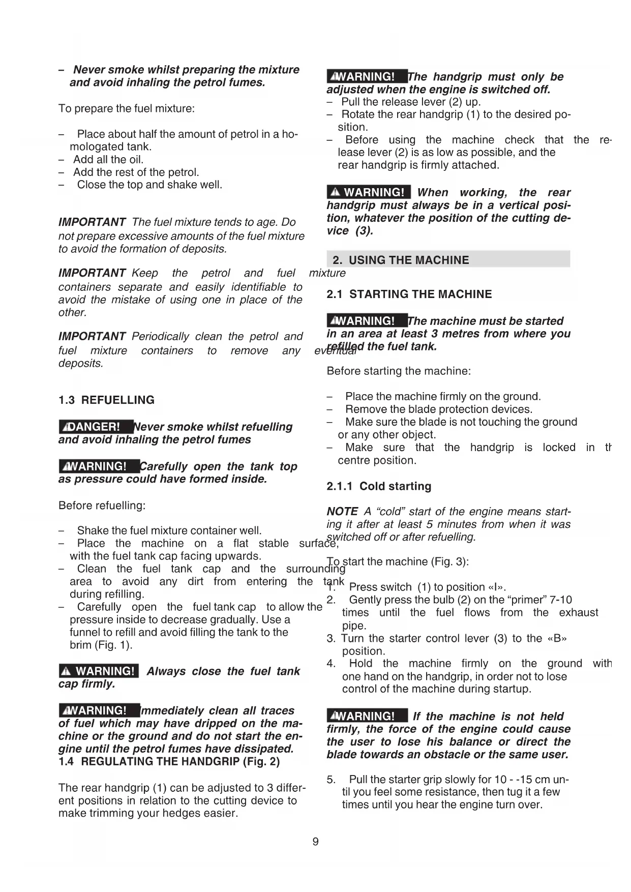 REGULATING THE HANDGRIP (Fig. 2) The rear handgrip (1) can be adjusted to 3 dier- ent positions in relation to the cutting device to make trimming your hedges easier. WARNING! The handgrip must only be adjusted when the engine is switched off. – Pull the release lever (2) up. – Rotate the rear handgrip (1) to the desired po- sition. – Before using the machine check that the re- lease lever (2) is as low as possible, and the rear handgrip is rmly attached. WARNING! When working, the rear handgrip must always be in a vertical posi- tion, whatever the position of the cutting de- vice (3).