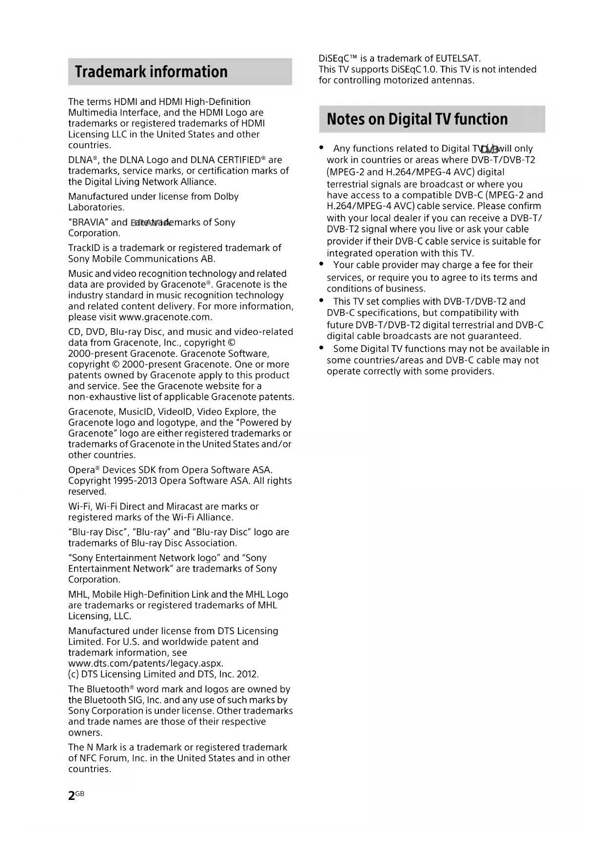 The terms HDMI and HDMI High-Definition Multimedia Interface, and the HDMI Logo are trademarks or registered trademarks of HDMI Licensing LLC in the United States and other countries. DLNA®, the DLNA Logo and DLNA CERTIFIED® are trademarks, service marks, or certification marks of the Digital Living Network Alliance. Manufactured under license from Dolby Laboratories. “BRAVIA” and are trademarks of Sony Corporation. TrackID is a trademark or registered trademark of Sony Mobile Communications AB. Music and video recognition technology and related data are provided by Gracenote®. Gracenote is the industry standard in music recognition technology and related content delivery. For more information, please visit www.gracenote.com. CD, DVD, Blu-ray Disc, and music and video-related data from Gracenote, Inc., copyright © 2000-present Gracenote. Gracenote Software, copyright © 2000-present Gracenote. One or more patents owned by Gracenote apply to this product and service. See the Gracenote website for a non-exhaustive list of applicable Gracenote patents. Gracenote, MusicID, VideoID, Video Explore, the Gracenote logo and logotype, and the “Powered by Gracenote” logo are either registered trademarks or trademarks of Gracenote in the United States and/or other countries. Opera® Devices SDK from Opera Software ASA. Copyright 1995-2013 Opera Software ASA. All rights reserved. Wi-Fi, Wi-Fi Direct and Miracast are marks or registered marks of the Wi-Fi Alliance. “Blu-ray Disc”, “Blu-ray” and “Blu-ray Disc” logo are trademarks of Blu-ray Disc Association. “Sony Entertainment Network logo” and “Sony Entertainment Network” are trademarks of Sony Corporation. MHL, Mobile High-Definition Link and the MHL Logo are trademarks or registered trademarks of MHL Licensing, LLC. Manufactured under license from DTS Licensing Limited. For U.S. and worldwide patent and trademark information, see www.dts.com/patents/legacy.aspx. (c) DTS Licensing Limited and DTS, Inc. 2012. The Bluetooth® word mark and logos are owned by the Bluetooth SIG, Inc. and any use of such marks by Sony Corporation is under license. Other trademarks and trade names are those of their respective owners. The N Mark is a trademark or registered trademark of NFC Forum, Inc. in the United States and in other countries. DiSEqC™ is a trademark of EUTELSAT. This TV supports DiSEqC 1.0. This TV is not intended for controlling motorized antennas. Any functions related to Digital TV ( ) will only work in countries or areas where DVB-T/DVB-T2 (MPEG-2 and H.264/MPEG-4 AVC) digital terrestrial signals are broadcast or where you have access to a compatible DVB-C (MPEG-2 and H.264/MPEG-4 AVC) cable service. Please confirm with your local dealer if you can receive a DVB-T/ DVB-T2 signal where you live or ask your cable provider if their DVB-C cable service is suitable for integrated operation with this TV. Your cable provider may charge a fee for their services, or require you to agree to its terms and conditions of business. This TV set complies with DVB-T/DVB-T2 and DVB-C specifications, but compatibility with future DVB-T/DVB-T2 digital terrestrial and DVB-C digital cable broadcasts are not guaranteed. Some Digital TV functions may not be available in some countries/areas and DVB-C cable may not operate correctly with some providers. Trademark information Notes on Digital TV function3
