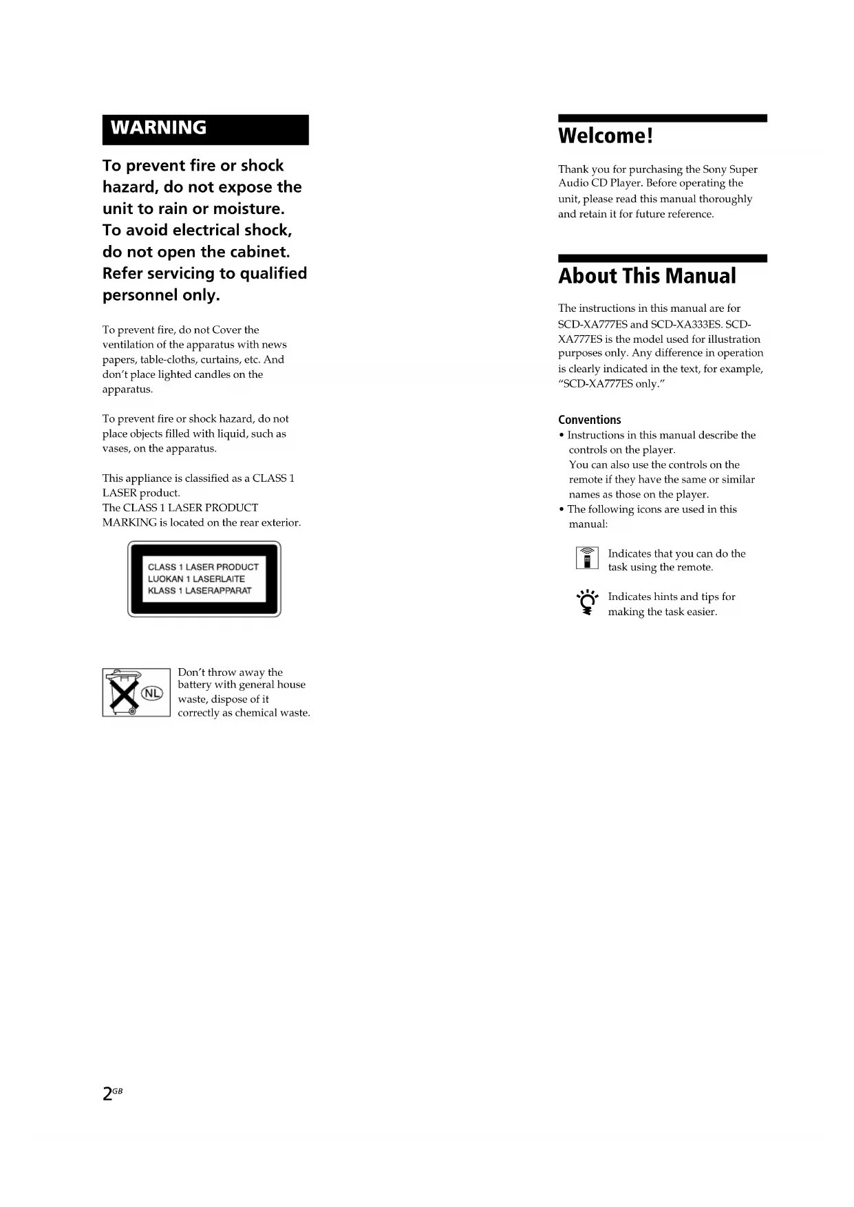 Welcome! Thank you for purchasing the Sony Super Audio CD Player. Before operating the unit, please read this manual thoroughly and retain it for future reference. About This Manual The instructions in this manual are for SCD-XA777ES and SCD-XA333ES. SCD- XA777ES is the model used for illustration purposes only. Any difference in operation is clearly indicated in the text, for example, “SCD-XA777ES only.” Conventions