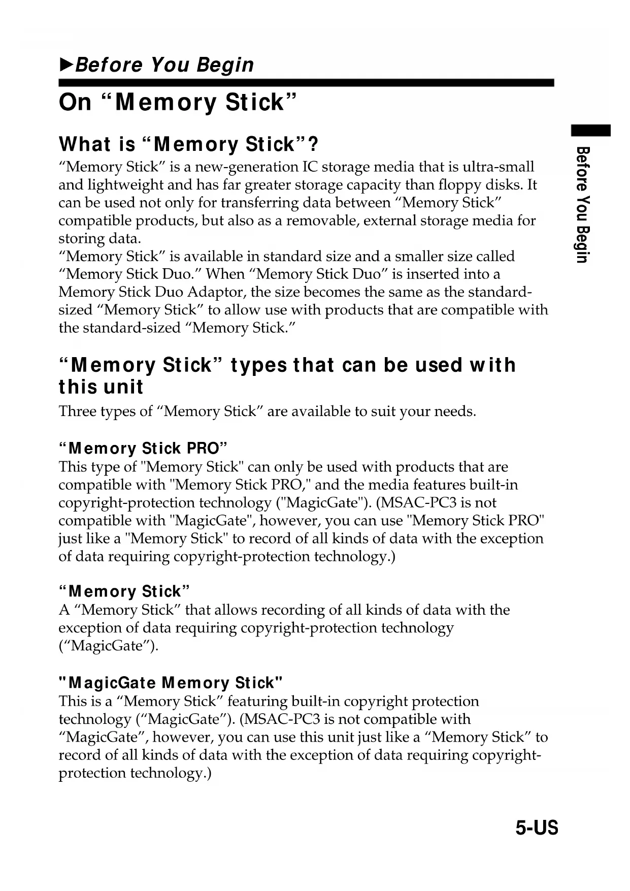 - All other company names and product names mentioned here may be the trademarks or registered trademarks of their respective companies. The symbols for ™ and ® are omitted in these instructions.4-US Table of contents Before You Begin On “Memory Stick” .............................................................................................. 5 Required system construction ............................................................................ 7 Checking the supplied accessories..................................................................... 8 Parts identification ............................................................................................... 8 How to Use (When Using Windows) Connecting this unit to your computer ............................................................. 9 Confirming that connections are completed .................................................. 12 When the Removable Disk is not displayed ................................................... 17 Copying image data recorded on “Memory Stick” to your computer ....... 21 Disconnecting this unit from your computer ................................................. 22 How to Use (When Using Macintosh) Connectiong this unit to your computer ......................................................... 24 Disconnecting this unit from your computer ................................................. 24 Other Information Formatting (initialization) of “Memory Stick” ............................................... 25 Precautions for use of “Memory Stick” ........................................................... 26 Precautions for use of “Memory Stick Duo” .................................................. 28 Troubleshooting.................................................................................................. 29 Specifications ....................................................................................................... 31 LIMITED WARRANTY ..................................................................................... 32Before You Begin 5-US BBefore You Begin On “Memory Stick” What is “Memory Stick”? “Memory Stick” is a new-generation IC storage media that is ultra-small and lightweight and has far greater storage capacity than floppy disks. It can be used not only for transferring data between “Memory Stick” compatible products, but also as a removable, external storage media for storing data. “Memory Stick” is available in standard size and a smaller size called “Memory Stick Duo.” When “Memory Stick Duo” is inserted into a Memory Stick Duo Adaptor, the size becomes the same as the standard- sized “Memory Stick” to allow use with products that are compatible with the standard-sized “Memory Stick.” “Memory Stick” types that can be used with this unit Three types of “Memory Stick” are available to suit your needs. “Memory Stick PRO” This type of "Memory Stick" can only be used with products that are compatible with "Memory Stick PRO," and the media features built-in copyright-protection technology ("MagicGate"). (MSAC-PC3 is not compatible with "MagicGate", however, you can use "Memory Stick PRO" just like a "Memory Stick" to record of all kinds of data with the exception of data requiring copyright-protection technology.) “Memory Stick” A “Memory Stick” that allows recording of all kinds of data with the exception of data requiring copyright-protection technology (“MagicGate”). "MagicGate Memory Stick" This is a “Memory Stick” featuring built-in copyright protection technology (“MagicGate”). (MSAC-PC3 is not compatible with “MagicGate”, however, you can use this unit just like a “Memory Stick” to record of all kinds of data with the exception of data requiring copyright- protection technology.)6-US On “Memory Stick” (continued) What is “MagicGate”? “MagicGate” is a copyright protection technology that operates when it is provided in both the “Memory Stick” and the product in which the media is used. A “Do you comply with “MagicGate”?” authentication takes place between devices equipped with “MagicGate”, and the “Memory Stick.” Data encryption takes places after the authentication. This unit is not equipped with “MagicGate”, so it can not record or playback the data which needs “MagicGate”.Before You Begin 7-US Required system construction Recommended Windows environment OS: Microsoft Windows 98/Windows 98Second Edition (Windows 98SE)/ Windows Millennium Edition (Windows Me)/Windows 2000 Professional (Windows 2000)/Windows XP Home Edition/XP Professional (Windows XP) Microsoft Windows CE/1.0/2.0/2.11/3.0