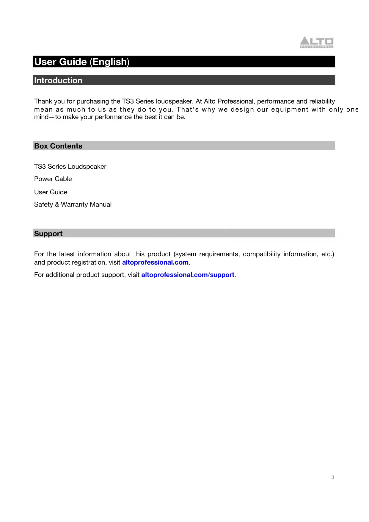 User Guide (English) Introduction Thank you for purchasing the TS3 Series loudspeaker. At Alto Professional, performance and reliability mean as much to us as they do to you. That’s why we design our equipment with only one thing in mind—to make your performance the best it can be.