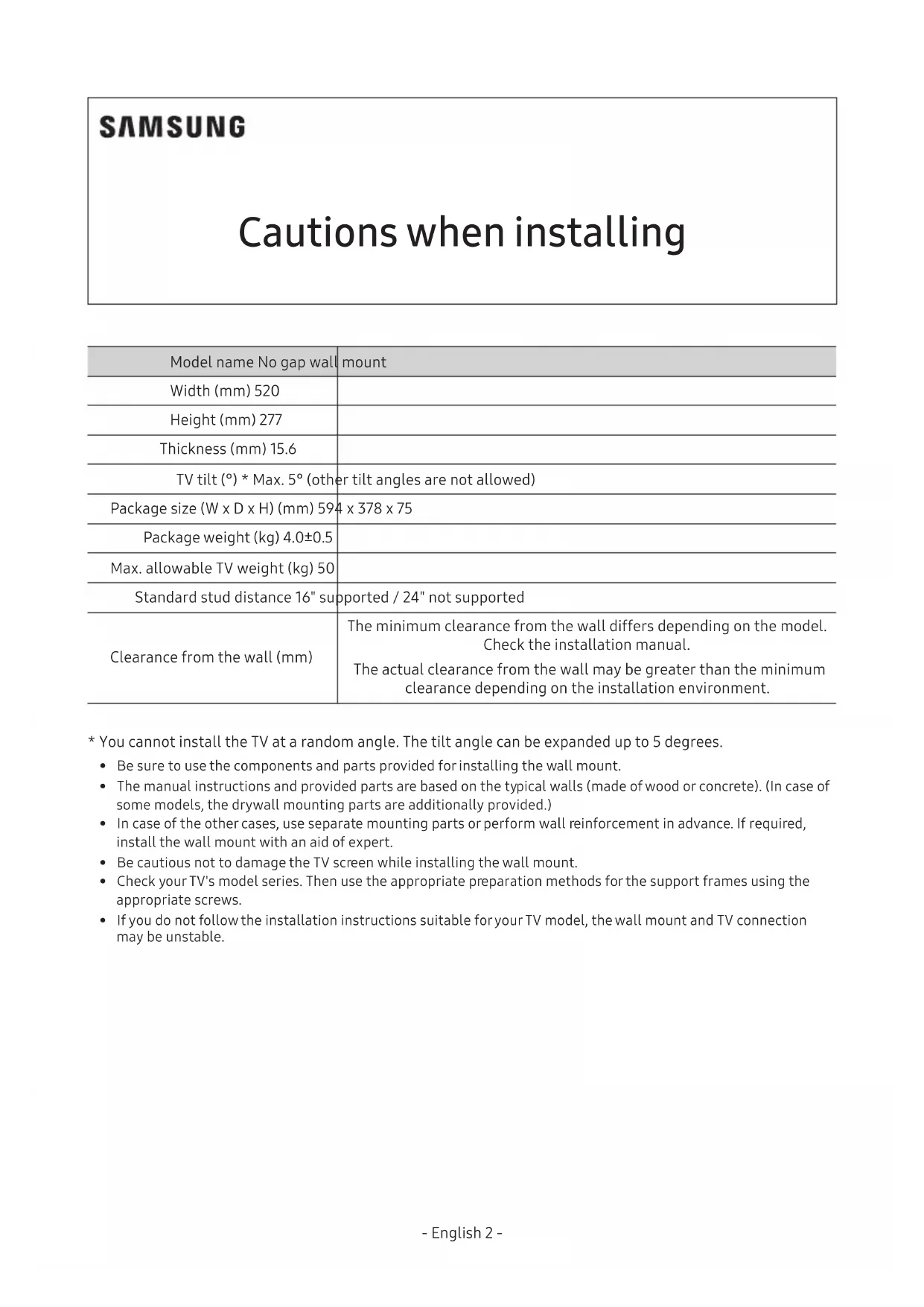 - A lot of force is required to open the bracket before installing the wall mount. Be careful not to hurt yourself when opening the bracket. (Brackets with tilt options are difcult to open because they need to withstand the weight of the TV.)- English 4 - - English 5 -