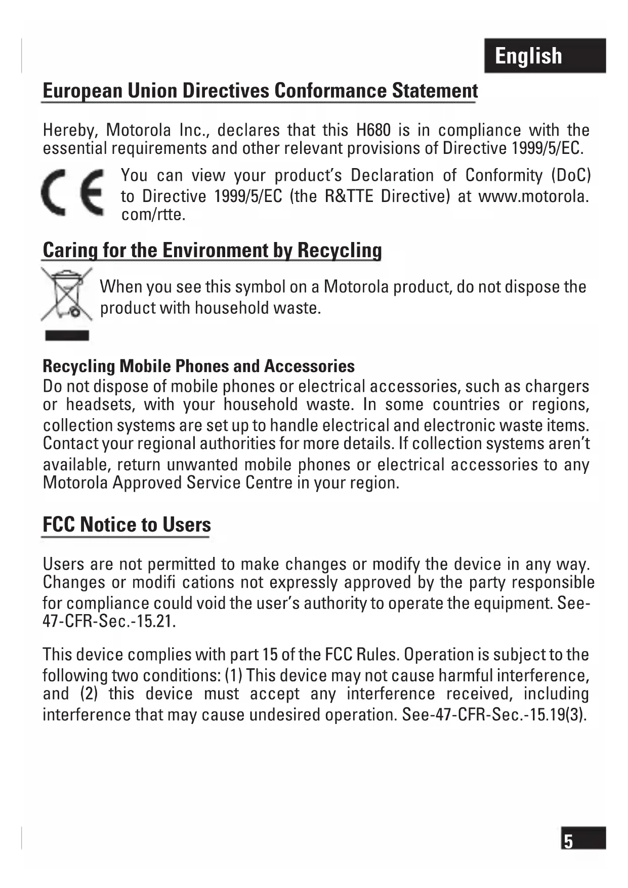 Figure 2 Figure 3 Figure 43 Figure 5 Figure 64 Figure 7 Power Switch Indicator Light5 European Union Directives Conformance Statement Hereby, Motorola Inc., declares that this H680 is in compliance with the essential requirements and other relevant provisions of Directive 1999/5/EC. You can view your product’s Declaration of Conformity (DoC) to Directive 1999/5/EC (the R&TTE Directive) at www.motorola. com/rtte. Caring for the Environment by Recycling When you see this symbol on a Motorola product, do not dispose the product with household waste. Recycling Mobile Phones and Accessories Do not dispose of mobile phones or electrical accessories, such as chargers or headsets, with your household waste. In some countries or regions, collection systems are set up to handle electrical and electronic waste items. Contact your regional authorities for more details. If collection systems aren’t available, return unwanted mobile phones or electrical accessories to any Motorola Approved Service Centre in your region. FCC Notice to Users Users are not permitted to make changes or modify the device in any way. Changes or modifi cations not expressly approved by the party responsible for compliance could void the user’s authority to operate the equipment. See- 47-CFR-Sec.-15.21. This device complies with part 15 of the FCC Rules. Operation is subject to the following two conditions: (1) This device may not cause harmful interference, and (2) this device must accept any interference received, including interference that may cause undesired operation. See-47-CFR-Sec.-15.19(3). English6 Before you begin See fi gure 1 on page 1. Take a moment before you get started to familiarize yourself with your new H680 Bluetooth Hands-free Headset. Along with your headset, a charger case is provided for both charging and storage. Bluetooth headset