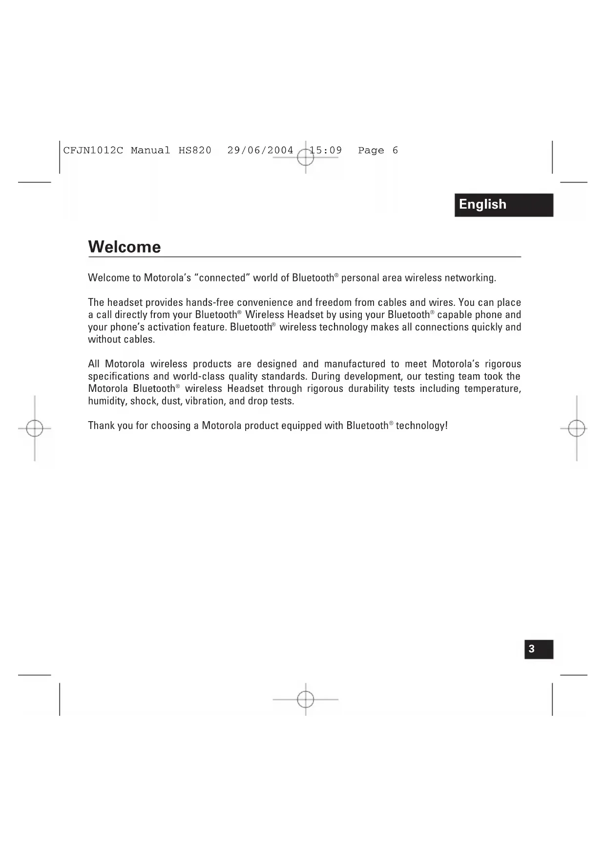 wireless Headset through rigorous durability tests including temperature, humidity, shock, dust, vibration, and drop tests. Thank you for choosing a Motorola product equipped with Bluetooth