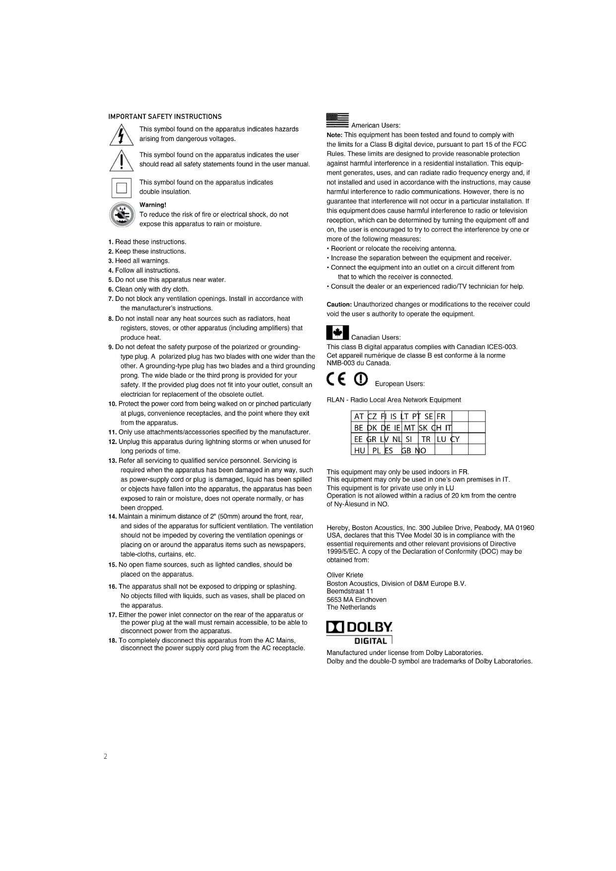 Caution: Unauthorized changes or modifications to the receiver could void the user s authority to operate the equipment. This symbol found on the apparatus indicates hazards arising from dangerous voltages. This symbol found on the apparatus indicates the user should read all safety statements found in the user manual. This symbol found on the apparatus indicates double insulation. Warning! To reduce the risk of fire or electrical shock, do not expose this apparatus to rain or moisture. Canadian Users: RLAN - Radio Local Area Network Equipment This equipment may only be used indoors in FR. This equipment may only be used in one’s own premises in IT. This equipment is for private use only in LU Operation is not allowed within a radius of 20 km from the centre of Ny-Ålesund in NO. Hereby, Boston Acoustics, Inc. 300 Jubilee Drive, Peabody, MA 01960 USA, declares that thisTVee Model 30is in compliance with the essential requirements and other relevant provisions of Directive 1999/5/EC.A copy of the Declaration of Conformity (DOC) may be obtained from: