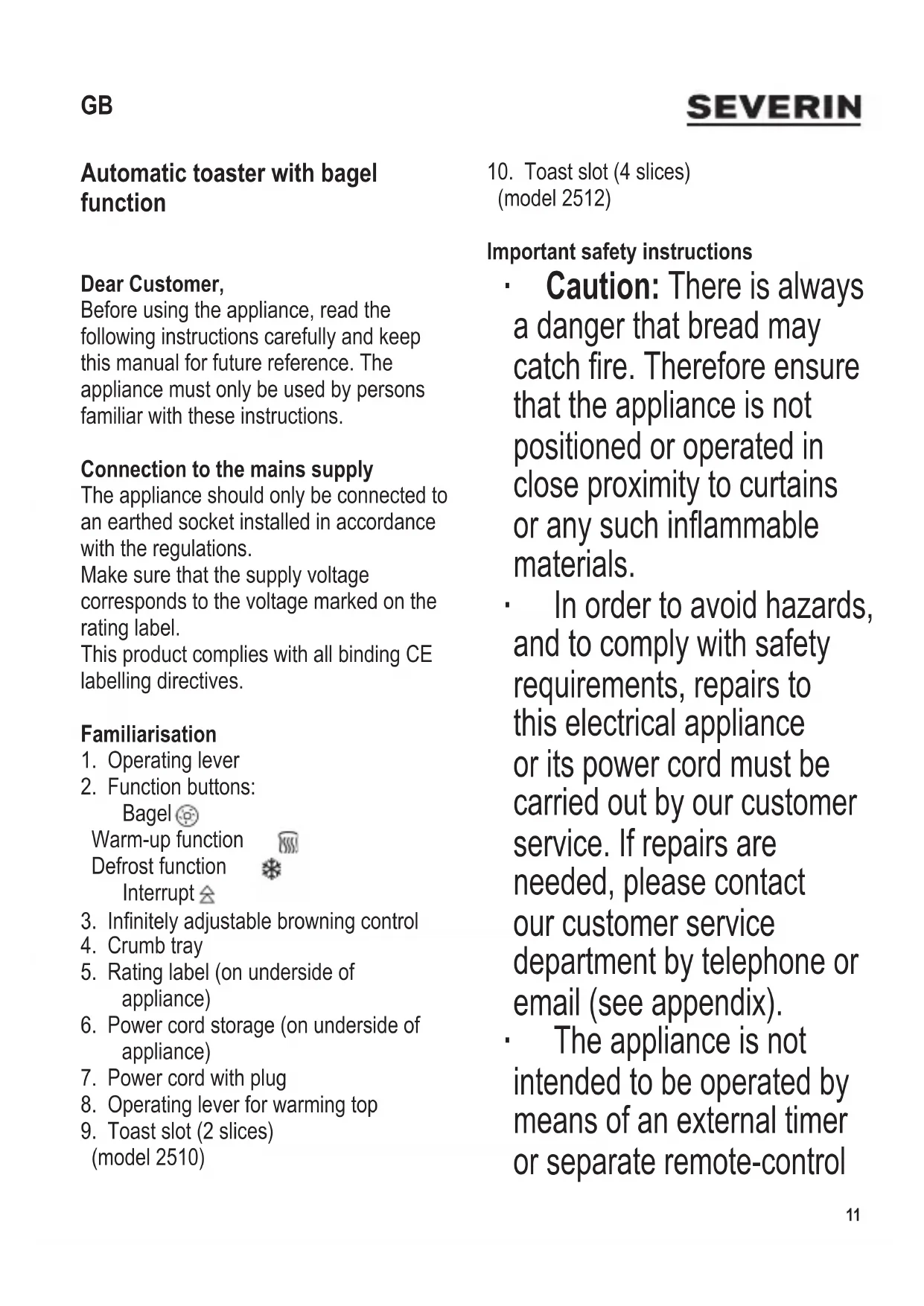 (model 2512) Important safety instructions ∙ Caution: There is always a danger that bread may catch re. Therefore ensure that the appliance is not positioned or operated in close proximity to curtains or any such inammable materials. ∙ In order to avoid hazards, and to comply with safety requirements, repairs to this electrical appliance or its power cord must be carried out by our customer service. If repairs are needed, please contact our customer service department by telephone or email (see appendix). ∙ The appliance is not intended to be operated by means of an external timer or separate remote-control GB12 104 x 142 mm system. ∙ Before cleaning the appliance, ensure it is disconnected from the power supply and has cooled down completely. ∙ To avoid the risk of electric shock, do not clean the appliance with liquids or immerse it. ∙ Clean the appliance by simply wiping the outside with a slightly damp cloth. ∙ To empty the crumb tray, push it in briey before pulling it out. Empty the tray and replace it. ∙ This appliance is intended for domestic or similar applications, such as - in staff kitchens in shops, ofces and other similar working environments, - in agricultural working environments, - by customers in hotels, motels etc. and similar accommodation, - in bed-and breakfast type environments. ∙ This appliance may be used by children (at least 8 years of age) and by persons with reduced physical, sensory or mental capabilities, or lacking experience and knowledge, provided they have been given supervision or instruction concerning the use of the appliance and fully understand all dangers and safety precautions involved. ∙ Children must not be permitted to play with the appliance. ∙ Children must not be permitted to carry out any cleaning or maintenance work on the appliance unless they are supervised104 x 142 mm