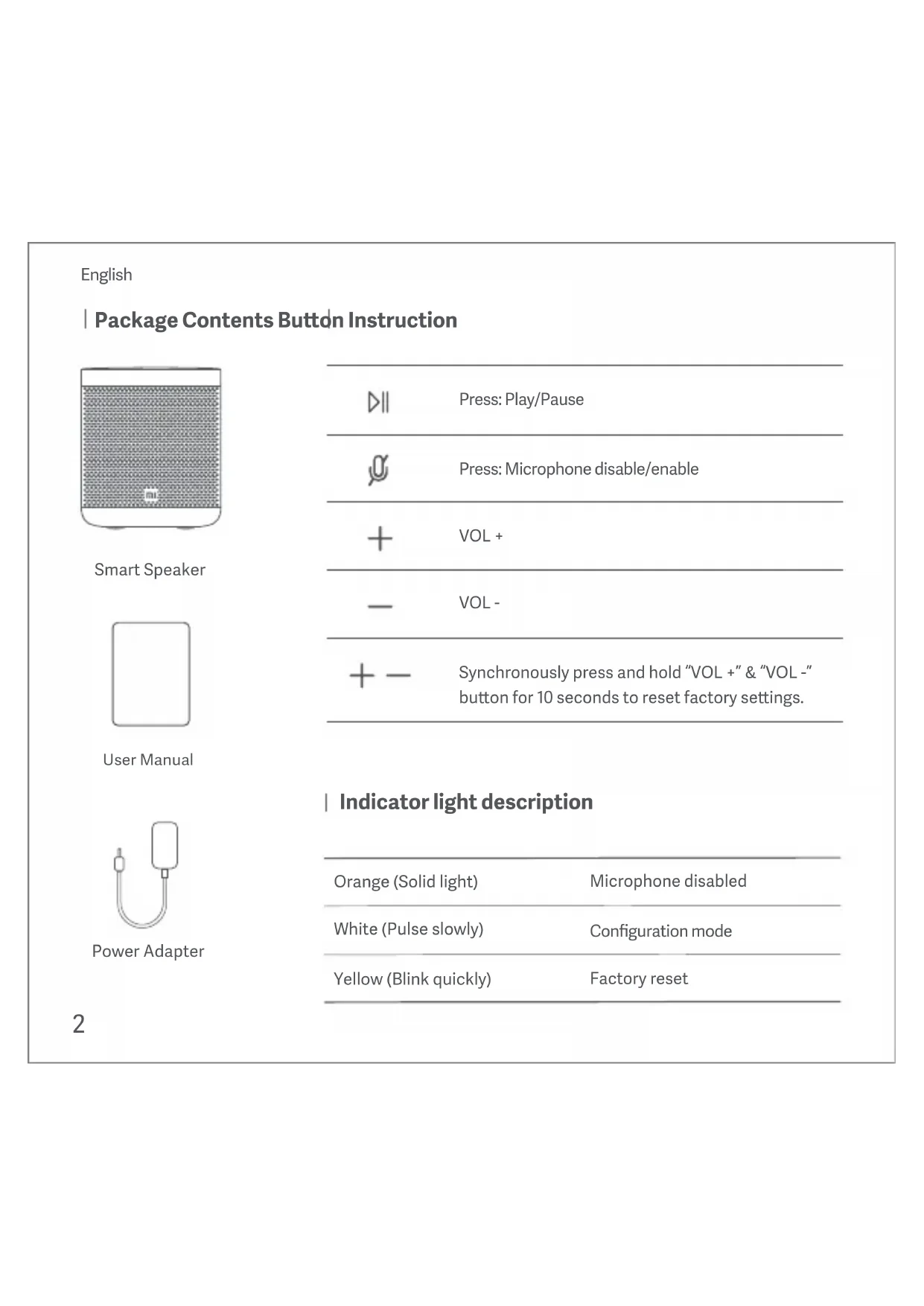 Orange (Solid light) White (Pulse slowly) Yellow (Blink quickly) Indicator light description Microphone disabled Configuration mode Factory resetYour Mi Smart Speaker. What you need to get started Geing Started