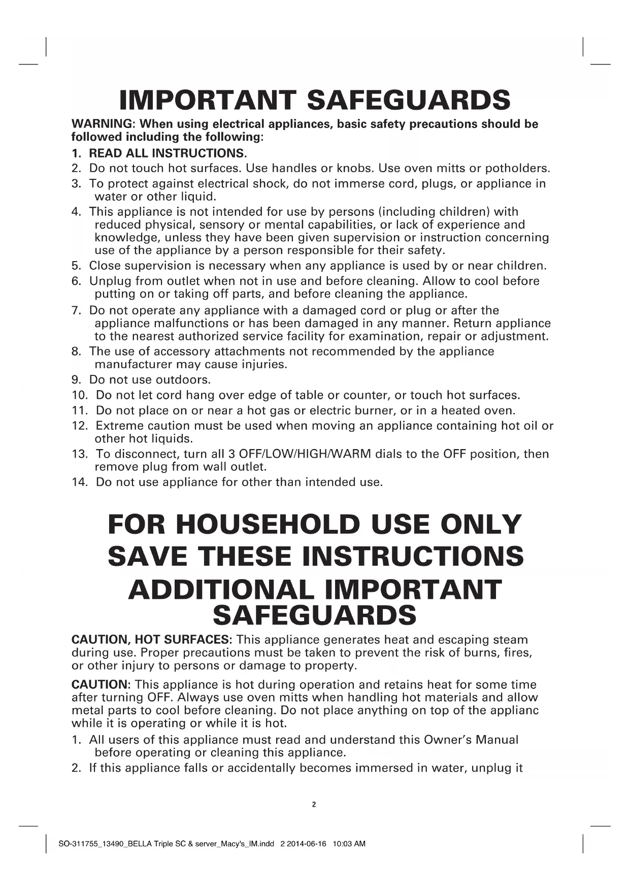SO-311755_13490_BELLA Triple SC & server_Macy's_IM.indd 2 2014-06-16 10:03 AMfrom the wall outlet immediately. Do not reach into the water!