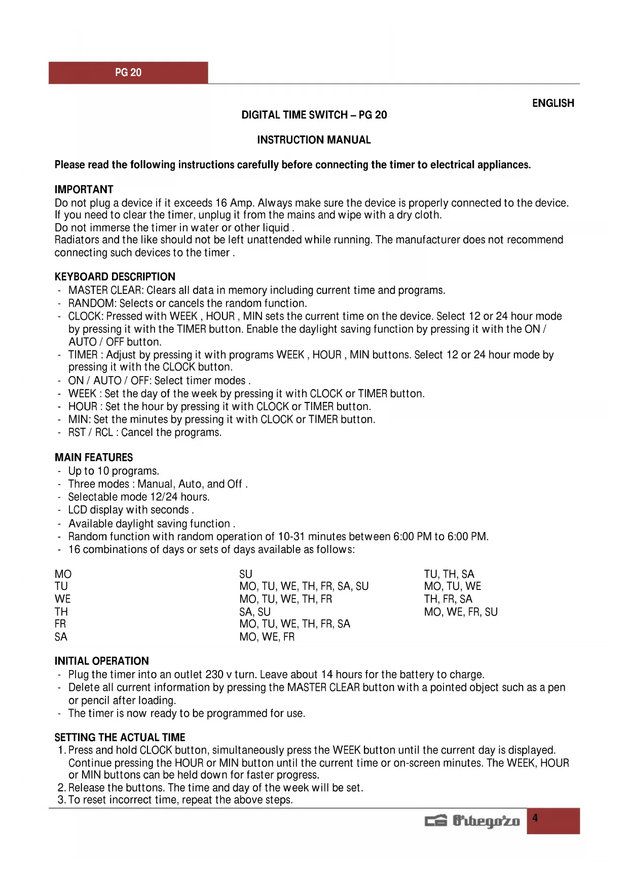 PG 20 - Electric timer Orbegozo - Free user manual and instructions