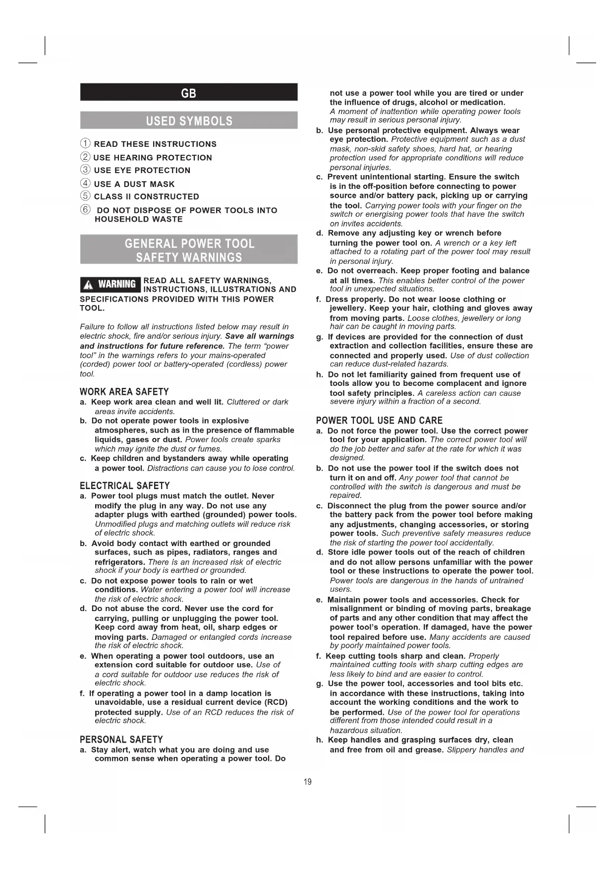 WARNING READ ALL SAFETY WARNINGS, INSTRUCTIONS, ILLUSTRATIONS AND SPECIFICATIONS PROVIDED WITH THIS POWER TOOL. Failure to follow all instructions listed below may result in electric shock, re and/or serious injury. Save all warnings and instructions for future reference. The term “power tool” in the warnings refers to your mains-operated (corded) power tool or battery-operated (cordless) power tool.