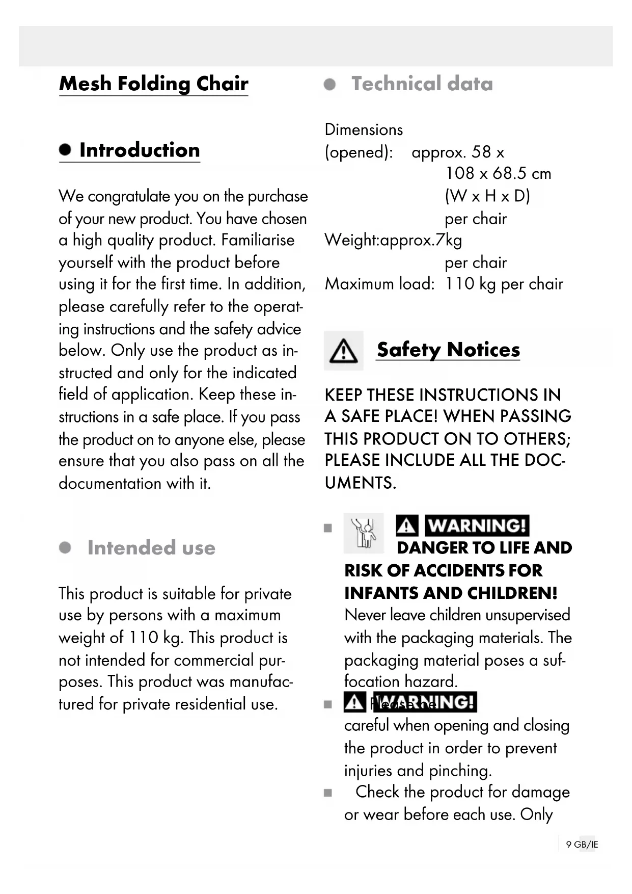 FOR INFANTS AND CHILDREN! Never leave children unsupervised with the packaging materials. The packaging material poses a suf- focation hazard. Please be careful when opening and closing the product in order to prevent injuries and pinching. Check the product for damage or wear before each use. Only10 GB/IE use the product in good condition. Do not use the product if damage is visible or suspected. Verify the product is stable be- fore use. Before use, place the product on a level, firm surface, otherwise the product could become unsta- ble and tip to the side and / or fall over. This can lead to injuries or damage. 11 0 kg Observe the maximum load capacity of 110 kg. If the weight limit is exceeded, this can lead to product damage and / or injuries. Keep your hands out of the fold- ing mechanism in order to avoid the risk of injury. Ensure that the folding function is correctly locked in place be- fore using the product. Ensure that the product has been fully opened before using it. This product is not a toy and should be used under adult su- pervision. The product may only be used by one person at a time. Never sit on the backrest, arm- rests or footrest (If applicable). Do not stand on the product. Secure the product in extreme weather, e.g. strong wind. Do not use the product close to a naked flame.