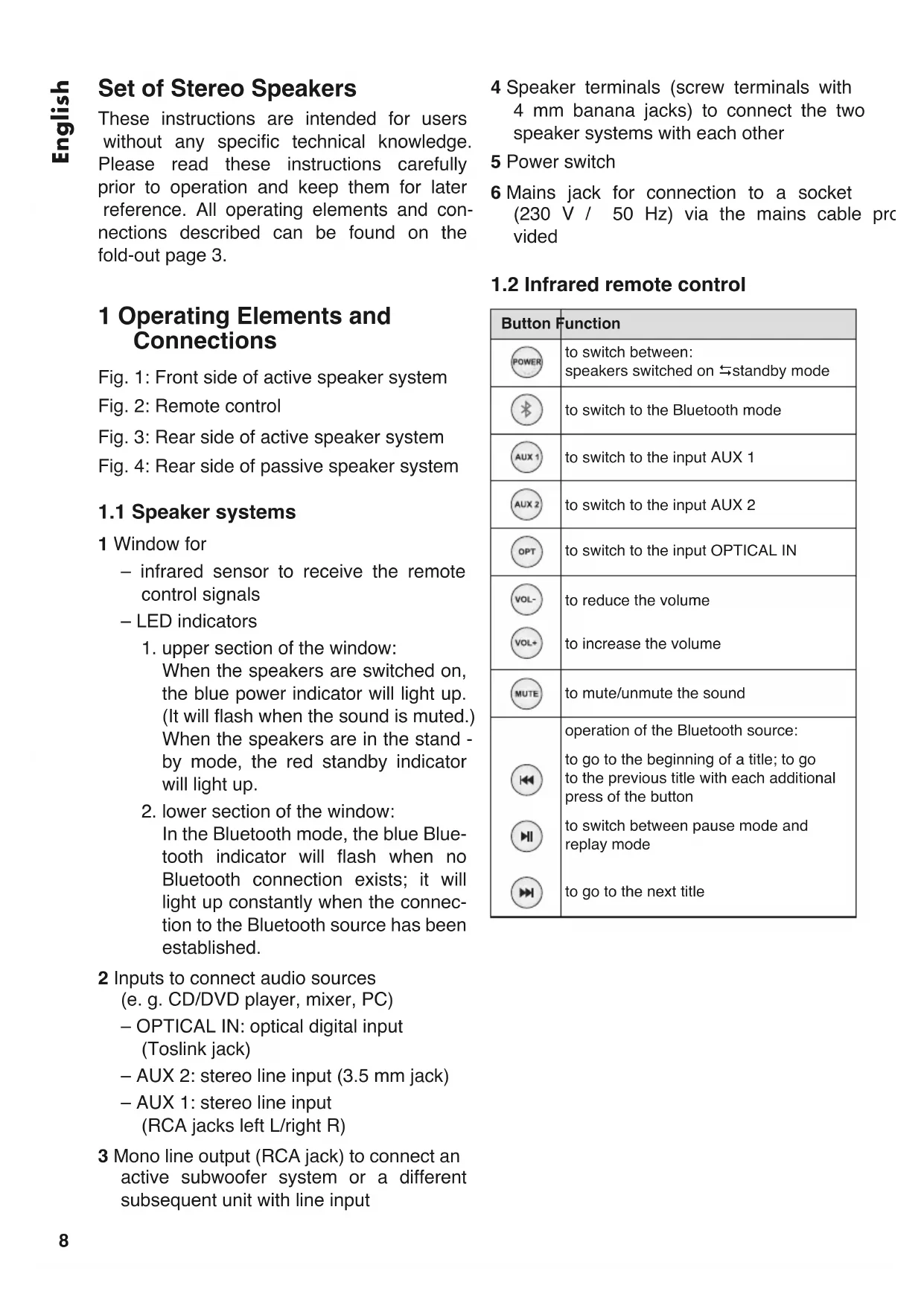 Button Function to switch between: speakers switched on standby mode to switch to the Bluetooth mode to switch to the input AUX 1 to switch to the input AUX 2 to switch to the input OPTICAL IN to reduce the volume to increase the volume to mute/unmute the sound operation of the Bluetooth source: to go to the beginning of a title; to go to the previous title with each additional press of the button to switch between pause mode and replay mode to go to the next titleEnglish