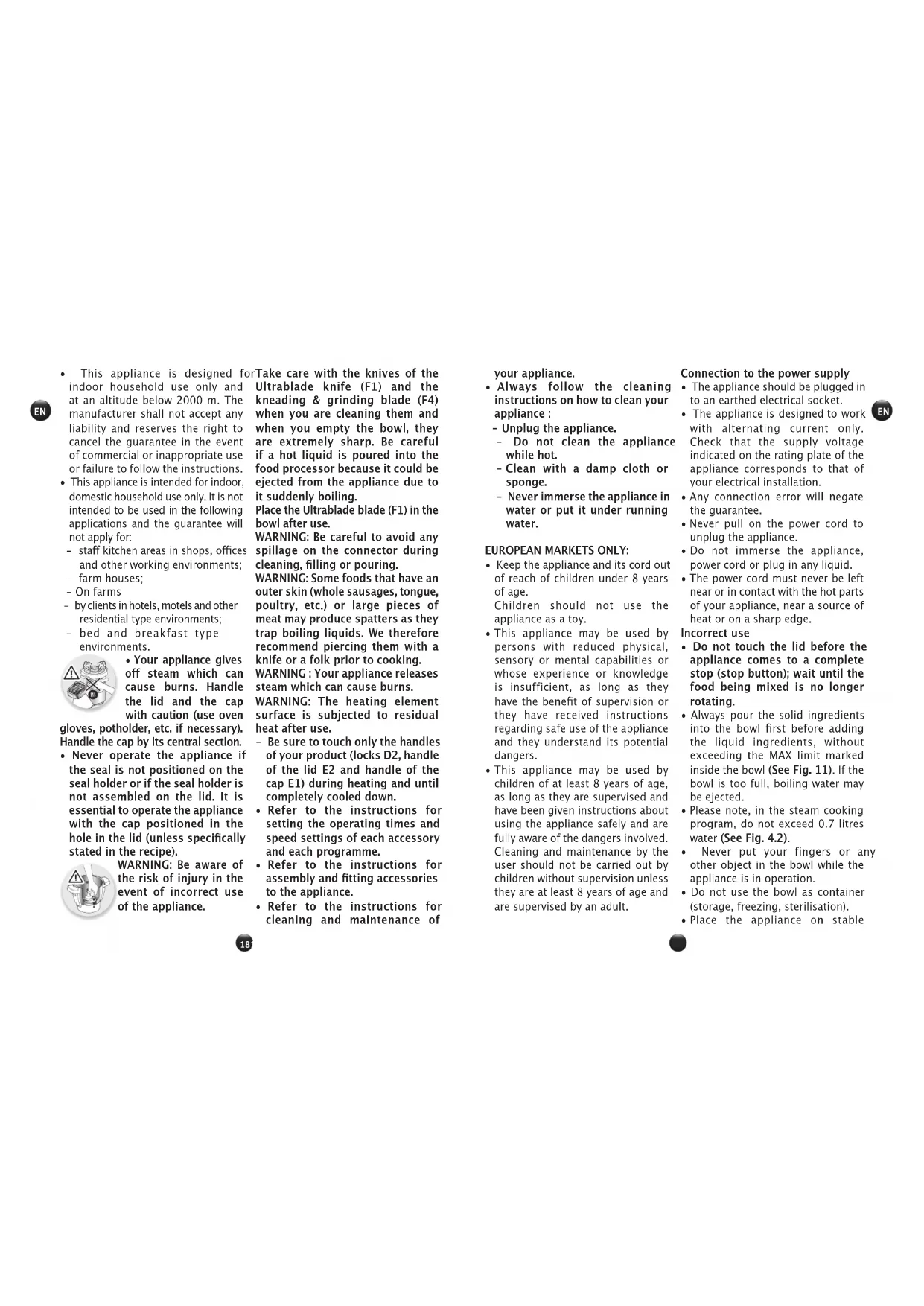 Take care with the knives of the Ultrablade knife (F1) and the kneading & grinding blade (F4) when you are cleaning them and when you empty the bowl, they are extremely sharp. Be careful if a hot liquid is poured into the food processor because it could be ejected from the appliance due to it suddenly boiling. Place the Ultrablade blade (F1) in the bowl after use.