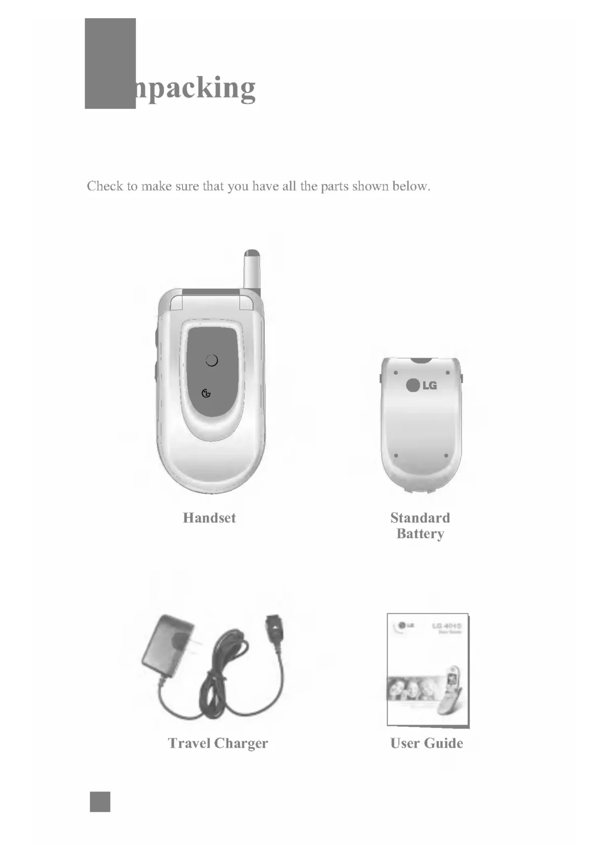 Index 1048Checktomakesurethatyouhaveallthe parts shownbelow. Unpacking Handset Standard Battery User Guide Travel ChargerImportant Information Thisuser guide contains important informationontheuseand operation ofthis phone. Pleasereadalltheinformation carefully for optimal performance andtopreventany damage to,ormisuseof,the phone. Any changes ormodificationsnot expressly approved inthisuser guide couldvoidyourwarrantyforthis equipment. Before You Start Safety Instructions WARNING! Toreducethe possibility ofelectricshock,donotexposeyour phone high humidity areas,suchasthebathroom, swimming pool, etc. Always store your phone awayfromheat.Neverstoreyour phone settings thatmayexposeittotemperatureslessthan-18°Corgreaterthan40°C,suchasoutside during asnowstormorinyourcaronahot day. Exposure toexcessivecoldorheatwillresultinmalfunction, damage and/or catastrophic failure.Becarefulwhen using your phone near otherelectronicdevices.RFemissionsfromyourmobile phone mayaffect nearby inadequately shieldedelectronic equipment. Youshouldconsultwithmanufacturersofany personal medicaldevicessuchas pacemakers and hearing aidestodetermineif they are susceptible tointerferencefromyourmobile phone. Turnoffyour phone inamedical facility oratagasstation.Never place your phone inamicrowaveovenasthiswillcausethe battery explode. IMPORTANT! PleasereadtheTIA SAFETY INFORMATIONonpage87before using your phone. For Your SafetySafety Information Pleasereadandobservethe following informationforthesafeandproperuseofyour phone andto prevent any unanticipated damage. Also, keep theuser'smanualinanaccessible place atalltimesafter reading it.