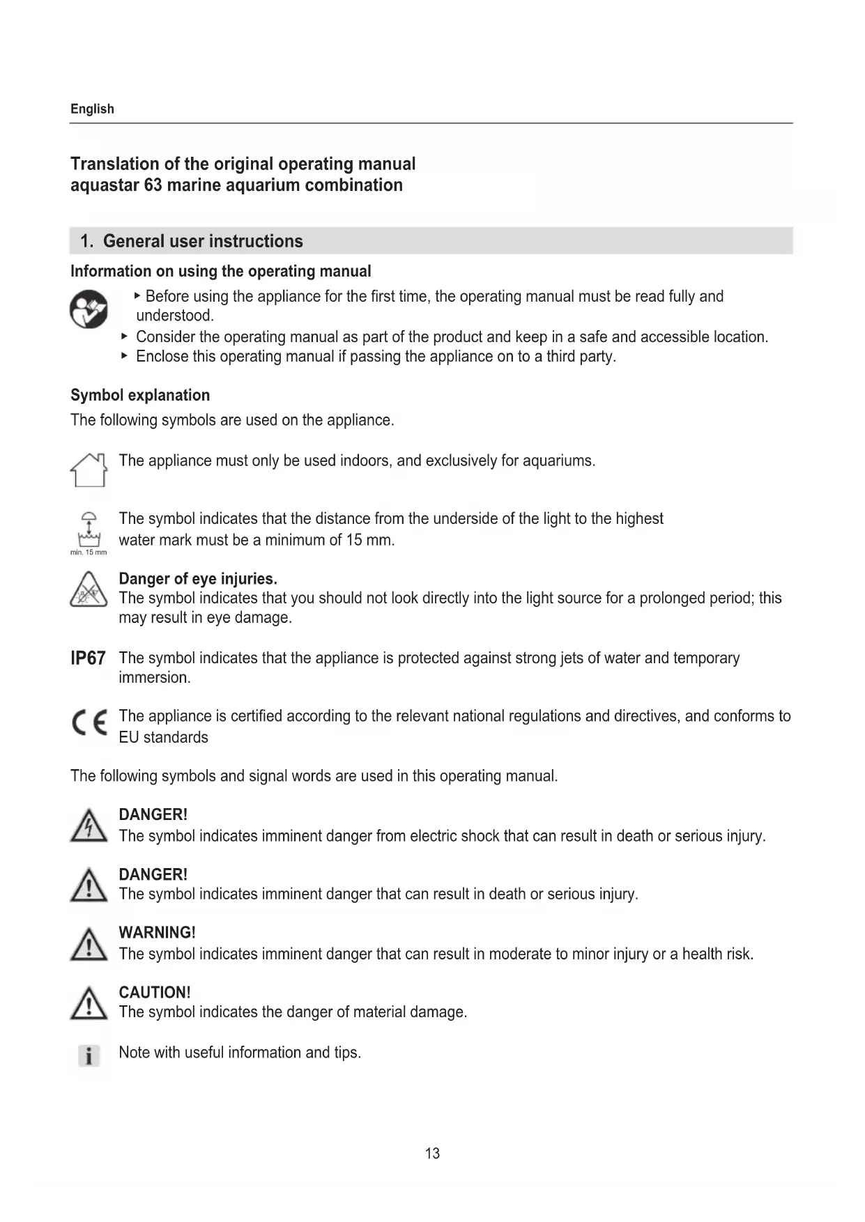 Information on using the operating manual ▶ Before using the appliance for the rst time, the operating manual must be read fully and understood. ▶ Consider the operating manual as part of the product and keep in a safe and accessible location. ▶ Enclose this operating manual if passing the appliance on to a third party. Symbol explanation The following symbols are used on the appliance. The appliance must only be used indoors, and exclusively for aquariums. The symbol indicates that the distance from the underside of the light to the highest water mark must be a minimum of 15 mm. Danger of eye injuries. The symbol indicates that you should not look directly into the light source for a prolonged period; this may result in eye damage. The symbol indicates that the appliance is protected against strong jets of water and temporary immersion. The appliance is certied according to the relevant national regulations and directives, and conforms to EU standards The following symbols and signal words are used in this operating manual. DANGER! The symbol indicates imminent danger from electric shock that can result in death or serious injury. DANGER! The symbol indicates imminent danger that can result in death or serious injury. WARNING! The symbol indicates imminent danger that can result in moderate to minor injury or a health risk. CAUTION! The symbol indicates the danger of material damage. Note with useful information and tips. min. 15 mm IP6714 English Typographical conventions Reference to a gure; in this case, reference to gure A You are prompted for an action.