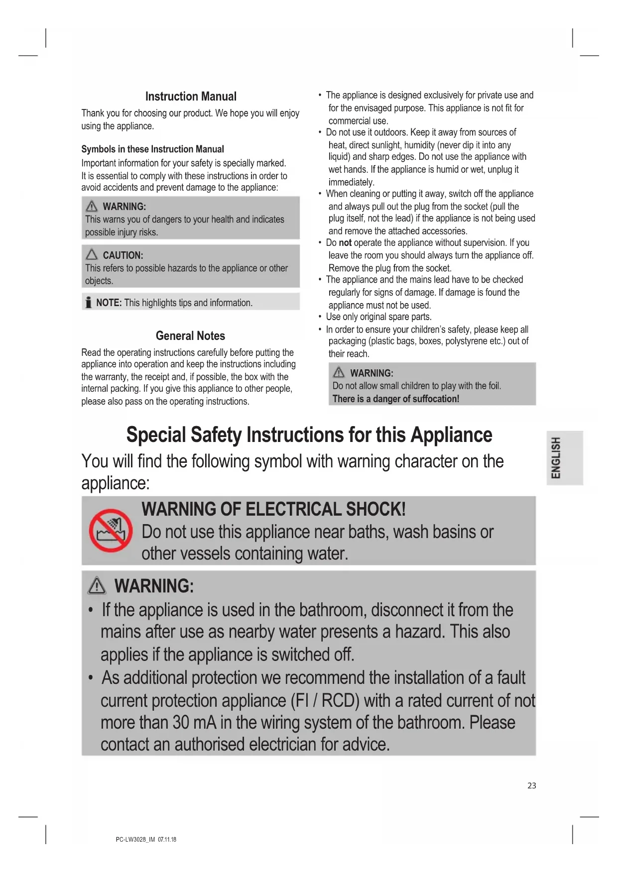 - As additional protection we recommend the installation of a fault current protection appliance (FI / RCD) with a rated current of not more than 30 mA in the wiring system of the bathroom. Please contact an authorised electrician for advice.24 PC-LW3028_IM 07.11.18