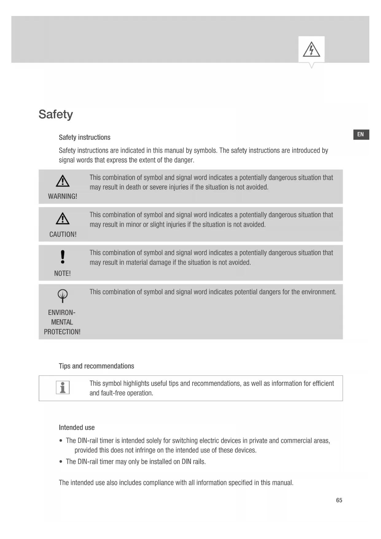- The DIN-rail timer may only be installed on DIN rails. The intended use also includes compliance with all information specied in this manual.66