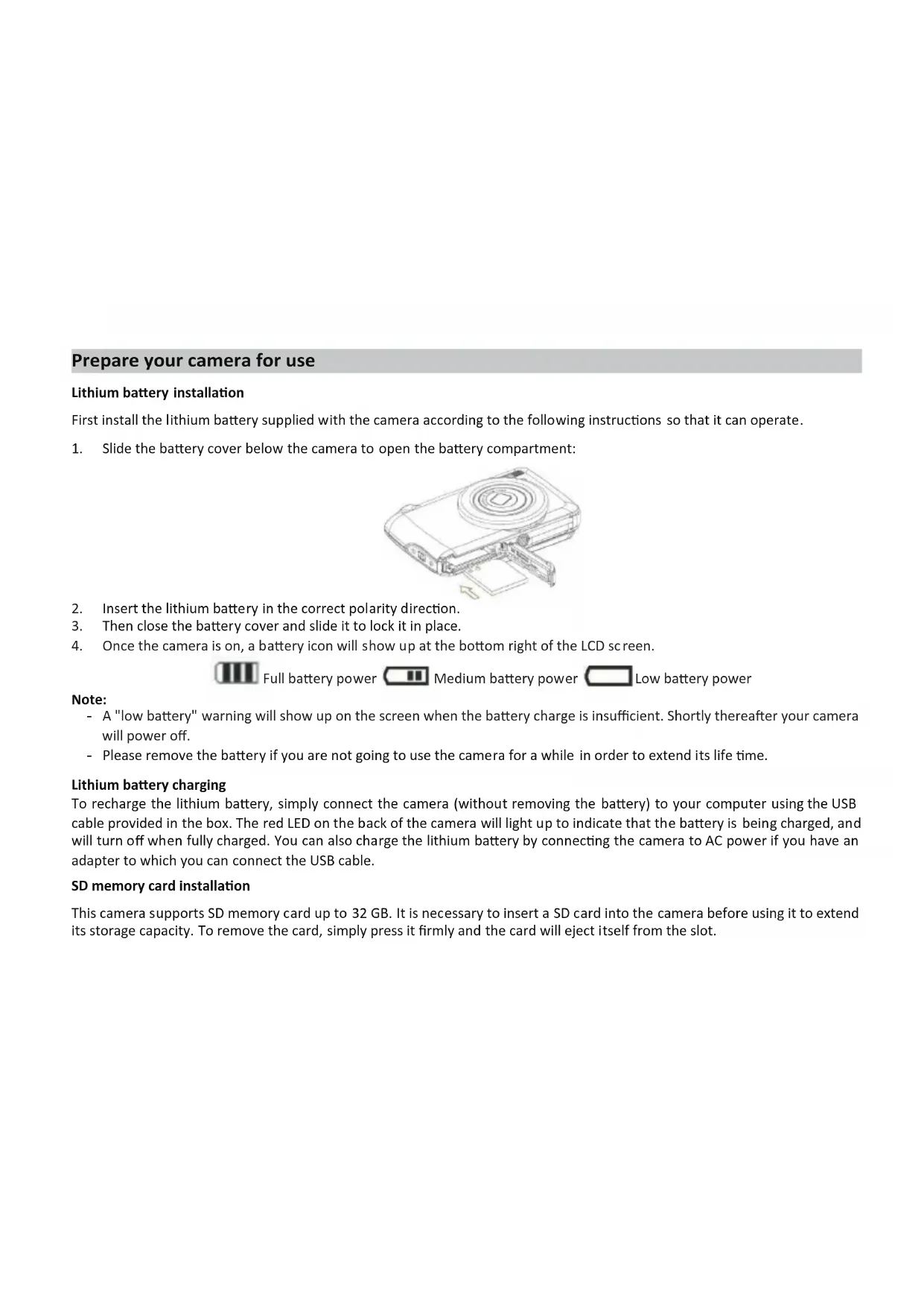 reen. Full baery power Medium baery power Low baery power Note: - A "low baery" warning will show up on the screen when the baery charge is insucient. Shortly thereaer your camera will power o. - Please remove the baery if you are not going to use the camera for a while in order to extend its life e. Lithium baery charging To recharge the lithium baery, simply connect the camera (without removing the baery) to your computer usi ng the USB cable provided in the box. The red LED on the back of the camera will light up to indicate that the baery is being charged, and will turn o when fully charged. You can also charge the lithium baery by connecng the camera to AC power if you have an adapter to which you can connect the USB cable. SD memory card installaon This camera supports SD memory card up to 32 GB. It is necessary to insert a SD card into the camera before using it to extend its storage capacity. To remove the card, simply press it rmly and the card will eject itself from the slot.Please refer to the below diagram for correct installaon:
