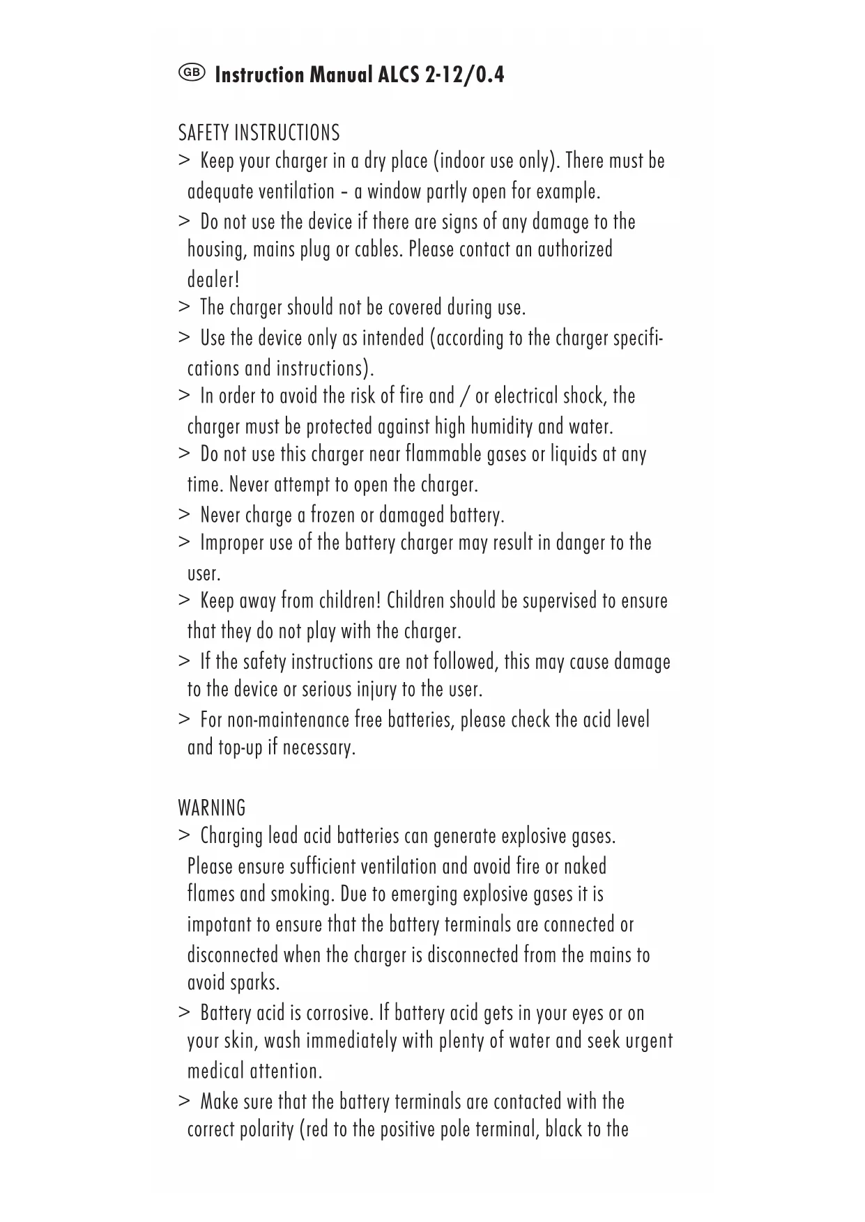 Alternatively, the battery can be left connected for an extended peri- od (e.g. for the winter). The charger detects any loss of capacity and recharges automatically. SPECIFICATIONS Input Voltage 100-240V AC / 50Hz – 60Hz Protection class II Protection IP20 Charge voltage 2V: 2,3V / 6V: 6,9V / 12V: 13,8V Charging current 400mA Battery capacity 1,2Ah – 40Ah DISCLAIMERS The information in this manual may be amended without notice. ANSMANN assumes no liability for any direct, indirect, incidental or consequential damages or any other damages caused by improper handling or disregard of the information contained in this manual. WARRANTY INFORMATION ANSMANN offers a 3 year warranty on this device. No guarantee will be given on damage to the charger due to non-compliance with these instructions. Information subject to change without prior notice. ANSMANN assumes no liability for printing errors. 08/2013 Návod k použití ALCS 2-12/0.4