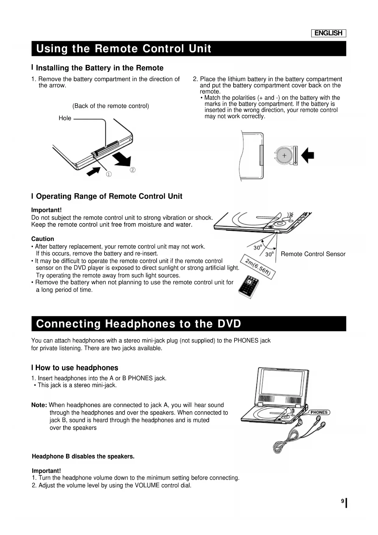 - Remove the battery when not planning to use the remote control unit for a long period of time. You can attach headphones with a stereo mini-jack plug (not supplied) to the PHONES jack for private listening. There are two jacks available. I How to use headphones