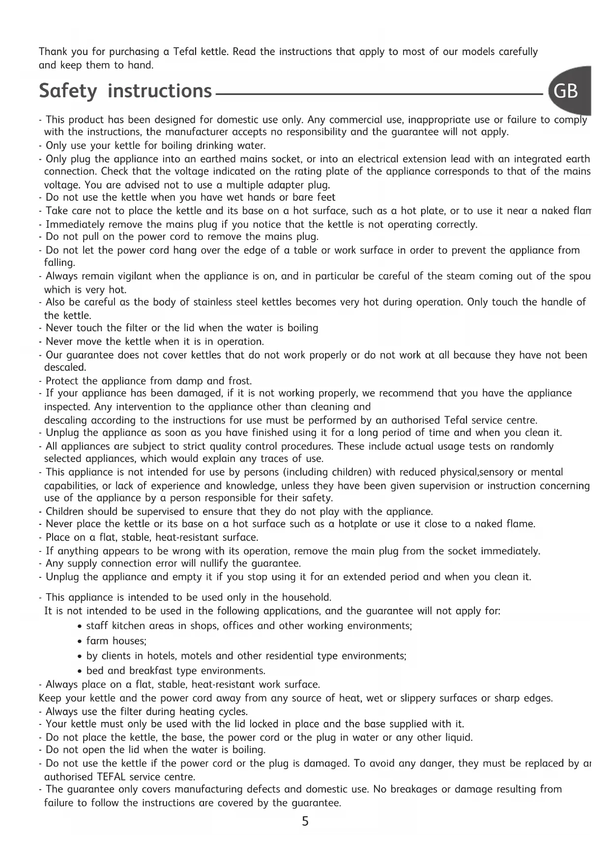 - This product has been designed for domestic use only. Any commercial use, inappropriate use or failure to comply with the instructions, the manufacturer accepts no responsibility and the guarantee will not apply. - Only use your kettle for boiling drinking water. - Only plug the appliance into an earthed mains socket, or into an electrical extension lead with an integrated earth connection. Check that the voltage indicated on the rating plate of the appliance corresponds to that of the mains voltage. You are advised not to use a multiple adapter plug. - Do not use the kettle when you have wet hands or bare feet - Take care not to place the kettle and its base on a hot surface, such as a hot plate, or to use it near a naked flame. - Immediately remove the mains plug if you notice that the kettle is not operating correctly. - Do not pull on the power cord to remove the mains plug. - Do not let the power cord hang over the edge of a table or work surface in order to prevent the appliance from falling. - Always remain vigilant when the appliance is on, and in particular be careful of the steam coming out of the spout, which is very hot. - Also be careful as the body of stainless steel kettles becomes very hot during operation. Only touch the handle of the kettle. - Never touch the filter or the lid when the water is boiling - Never move the kettle when it is in operation. - Our guarantee does not cover kettles that do not work properly or do not work at all because they have not been descaled. - Protect the appliance from damp and frost. - If your appliance has been damaged, if it is not working properly, we recommend that you have the appliance inspected. Any intervention to the appliance other than cleaning and descaling according to the instructions for use must be performed by an authorised Tefal service centre. - Unplug the appliance as soon as you have finished using it for a long period of time and when you clean it. - All appliances are subject to strict quality control procedures. These include actual usage tests on randomly selected appliances, which would explain any traces of use. - This appliance is not intended for use by persons (including children) with reduced physical,sensory or mental capabilities, or lack of experience and knowledge, unless they have been given supervision or instruction concerning use of the appliance by a person responsible for their safety. - Children should be supervised to ensure that they do not play with the appliance. - Never place the kettle or its base on a hot surface such as a hotplate or use it close to a naked flame. - Place on a flat, stable, heat-resistant surface. - If anything appears to be wrong with its operation, remove the main plug from the socket immediately. - Any supply connection error will nullify the guarantee. - Unplug the appliance and empty it if you stop using it for an extended period and when you clean it. - This appliance is intended to be used only in the household. It is not intended to be used in the following applications, and the guarantee will not apply for: