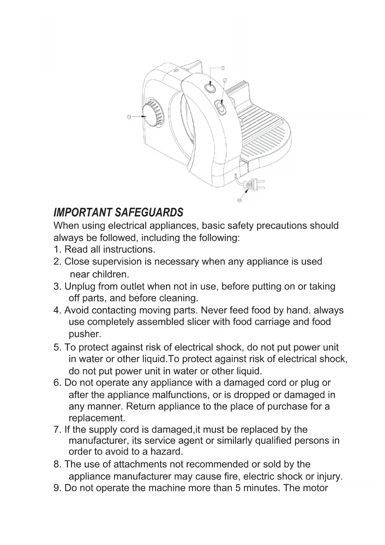 9. Do not operate the machine more than 5 minutes. The motor