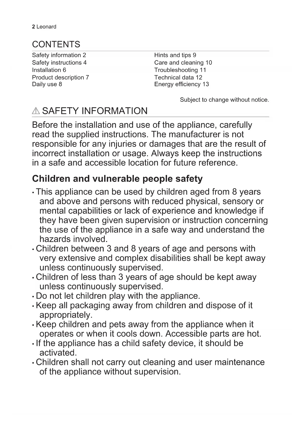- Children shall not carry out cleaning and user maintenance of the appliance without supervision. 2 LeonardGeneral Safety