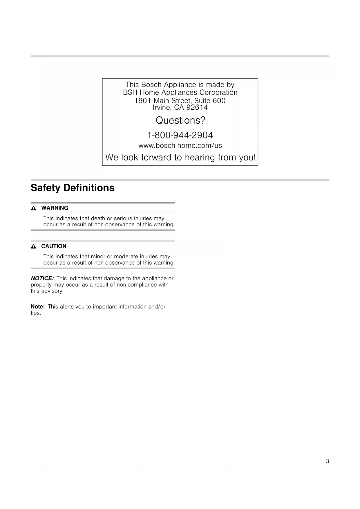 - Warranty Exclusions Produktinfo. Additional information on products, accessories, replacement parts and services can be found at www.bosch-home.com and in the online shop www.bosch-home.com/us/store3 Safety Definitions 9 WARNING This indicates that death or serious injuries may occur as a result of non-observance of this warning. 9 CAUTION This indicates that minor or moderate injuries may occur as a result of non-observance of this warning. NOTICE: This indicates that damage to the appliance or property may occur as a result of non-compliance with this advisory. Note: This alerts you to important information and/or tips. 4XHVWLRQV" ZZZERVFKKRPHFRPXV p. 23