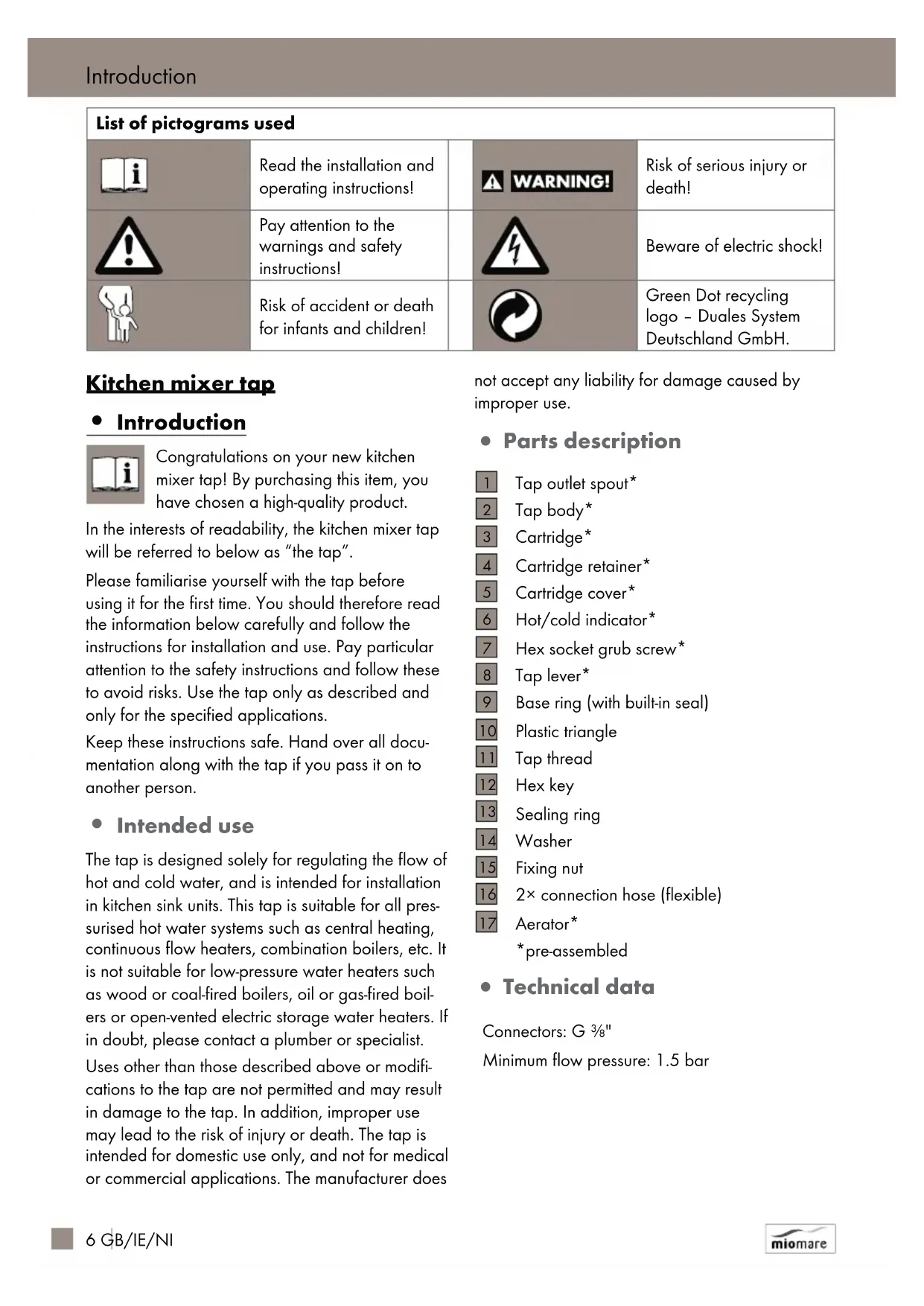 Technical data Connectors: G ⅜" Minimum flow pressure: 1.5 bar List of pictograms used Read the installation and operating instructions! Risk of serious injury or death! Pay attention to the warnings and safety instructions! Beware of electric shock! Risk of accident or death for infants and children! Green Dot recycling logo – Duales System Deutschland GmbH.7GB/IE/ NI Installation