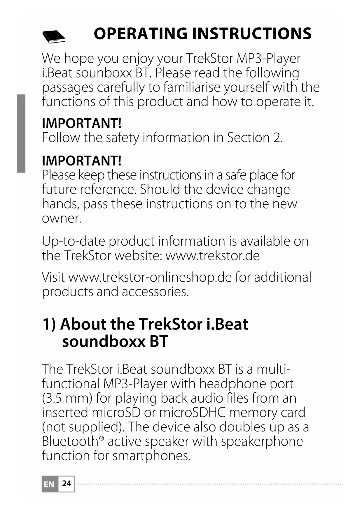 OPERATING INSTRUCTIONS We hope you enjoy your TrekStor MP3-Player i.Beat sounboxx BT. Please read the following passages carefully to familiarise yourself with the functions of this product and how to operate it. IMPORTANT! Follow the safety information in Section 2. IMPORTANT! Please keep these instructions in a safe place for future reference. Should the device change hands, pass these instructions on to the new owner. Up-to-date product information is available on the TrekStor website: www.trekstor.de Visit www.trekstor-onlineshop.de for additional products and accessories.