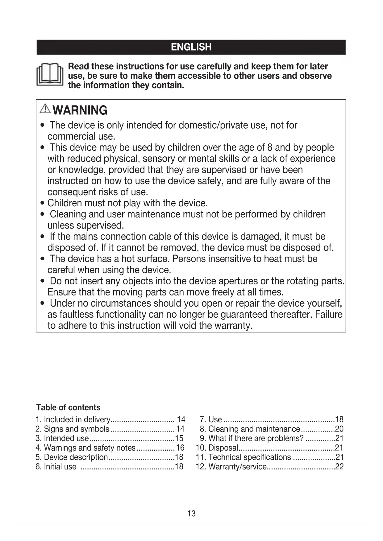 Never attempt to open and/or repair the device yourself. Repairs may only be carried out by Customer Services or authorised retailers. Failure to comply with this instruction will void the warranty.