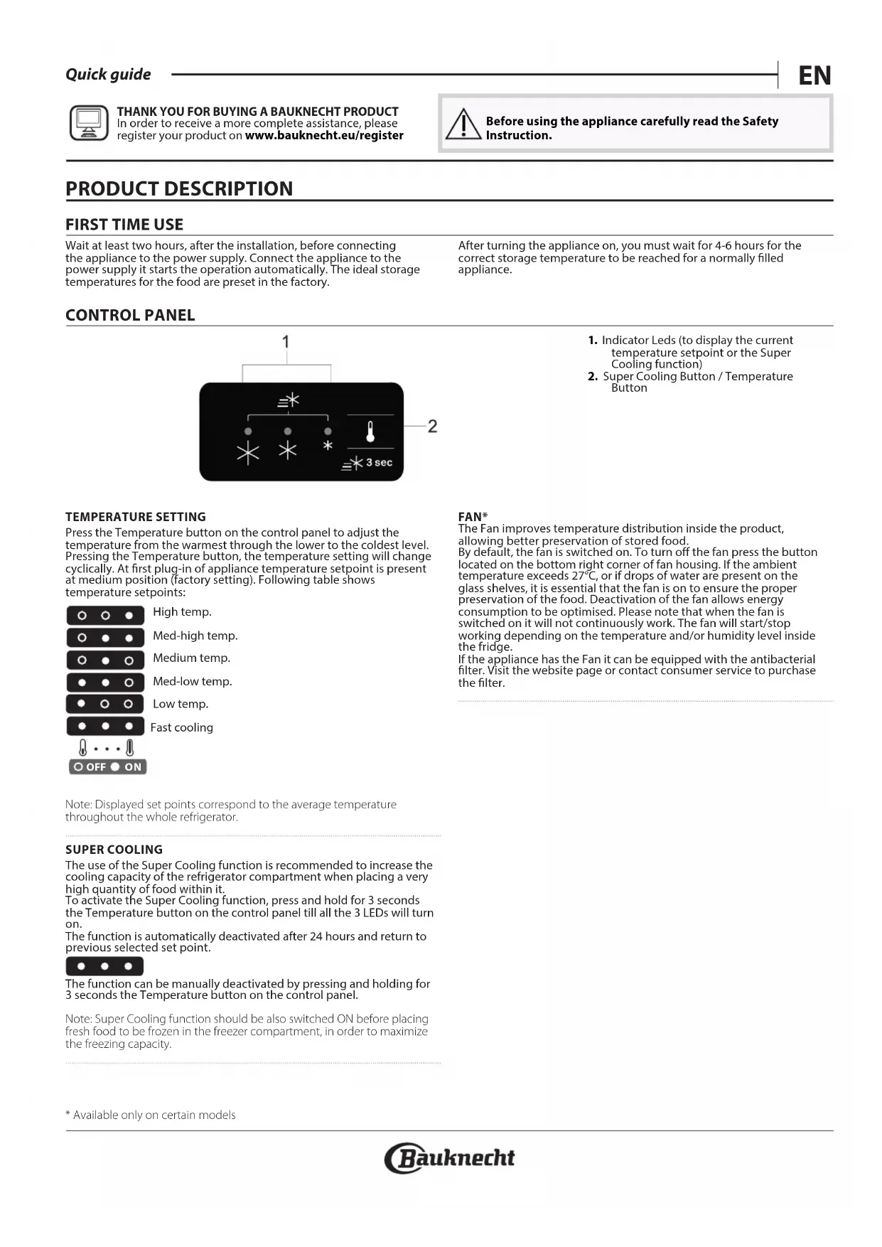 Button TEMPERATURE SETTING Press the Temperature button on the control panel to adjust the temperature from the warmest through the lower to the coldest level. Pressing the Temperature button, the temperature setting will change cyclically. At rst plug-in of appliance temperature setpoint is present at medium position (factory setting). Following table shows temperature setpoints: Note: Displayed set points correspond to the average temperature throughout the whole refrigerator. SUPER COOLING The use of the Super Cooling function is recommended to increase the cooling capacity of the refrigerator compartment when placing a very high quantity of food within it. To activate the Super Cooling function, press and hold for 3 seconds the Temperature button on the control panel till all the 3 LEDs will turn on. The function is automatically deactivated after 24 hours and return to previous selected set point. The function can be manually deactivated by pressing and holding for 3 seconds the Temperature button on the control panel. Note: Super Cooling function should be also switched ON before placing fresh food to be frozen in the freezer compartment, in order to maximize the freezing capacity. FAN* The Fan improves temperature distribution inside the product, allowing better preservation of stored food. By default, the fan is switched on. To turn o the fan press the button located on the bottom right corner of fan housing. If the ambient temperature exceeds 27°C, or if drops of water are present on the glass shelves, it is essential that the fan is on to ensure the proper preservation of the food. Deactivation of the fan allows energy consumption to be optimised. Please note that when the fan is switched on it will not continuously work. The fan will start/stop working depending on the temperature and/or humidity level inside the fridge. If the appliance has the Fan it can be equipped with the antibacterial lter. Visit the website page or contact consumer service to purchase the lter.