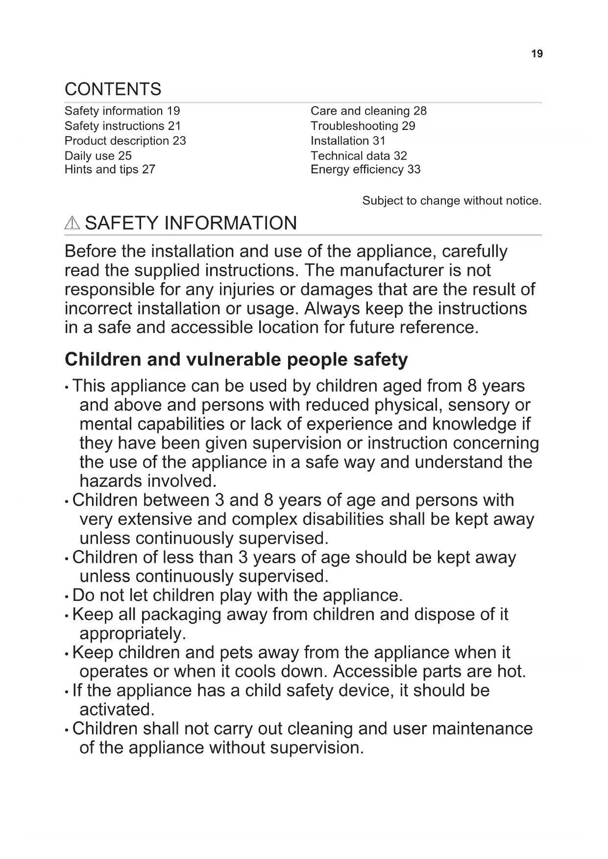 - Children shall not carry out cleaning and user maintenance of the appliance without supervision. 19General Safety