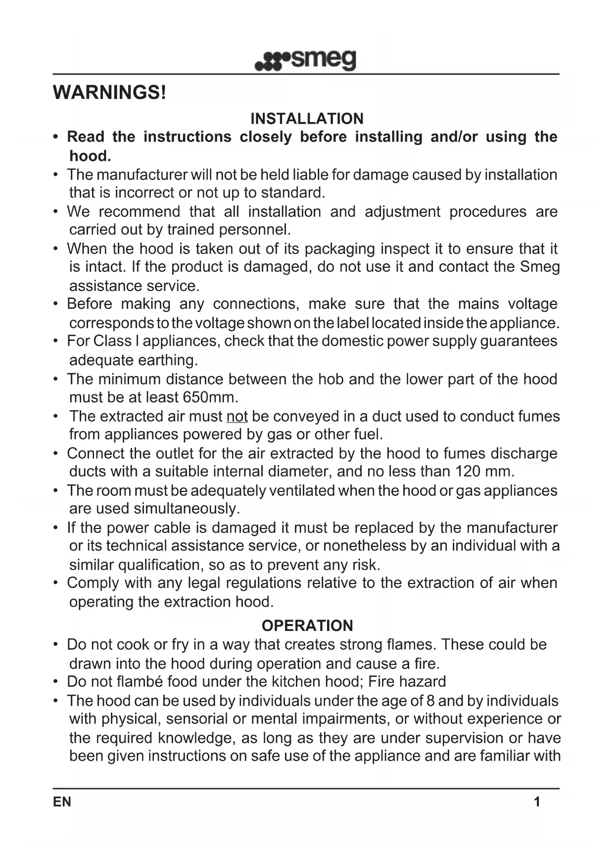 - When the hood is taken out of its packaging inspect it to ensure that it is intact. If the product is damaged, do not use it and contact the Smeg assistance service.