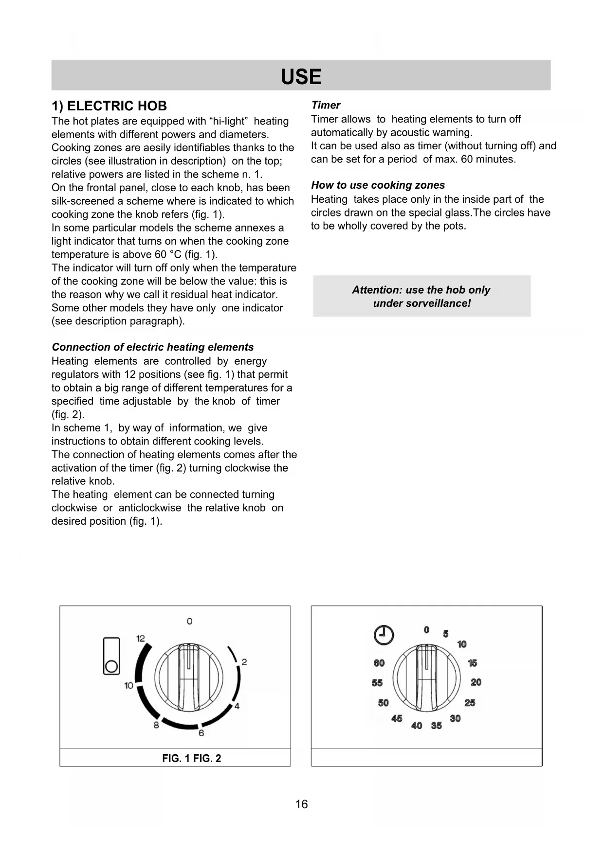 The hot plates are equipped with “hi-light” heating elements with different powers and diameters. Cooking zones are aesily identifiables thanks to the circles (see illustration in description) on the top; relative powers are listed in the scheme n. 1. On the frontal panel, close to each knob, has been silk-screened a scheme where is indicated to which cooking zone the knob refers (fig. 1). In some particular models the scheme annexes a light indicator that turns on when the cooking zone temperature is above 60 °C (fig. 1). The indicator will turn off only when the temperature of the cooking zone will be below the value: this is the reason why we call it residual heat indicator. Some other models they have only one indicator (see description paragraph). Connection of electric heating elements Heating elements are controlled by energy regulators with 12 positions (see fig. 1) that permit to obtain a big range of different temperatures for a specified time adjustable by the knob of timer (fig. 2). In scheme 1, by way of information, we give instructions to obtain different cooking levels. The connection of heating elements comes after the activation of the timer (fig. 2) turning clockwise the relative knob. The heating element can be connected turning clockwise or anticlockwise the relative knob on desired position (fig. 1). Timer Timer allows to heating elements to turn off automatically by acoustic warning. It can be used also as timer (without turning off) and can be set for a period of max. 60 minutes. How to use cooking zones Heating takes place only in the inside part of the circles drawn on the special glass.The circles have to be wholly covered by the pots. Attention: use the hob only under sorveillance! FIG. 1 FIG. 217 USE SCHEME 1 1 145 “hi-light” 1200 1 2 180 “hi-light” 1800 1 - 4
