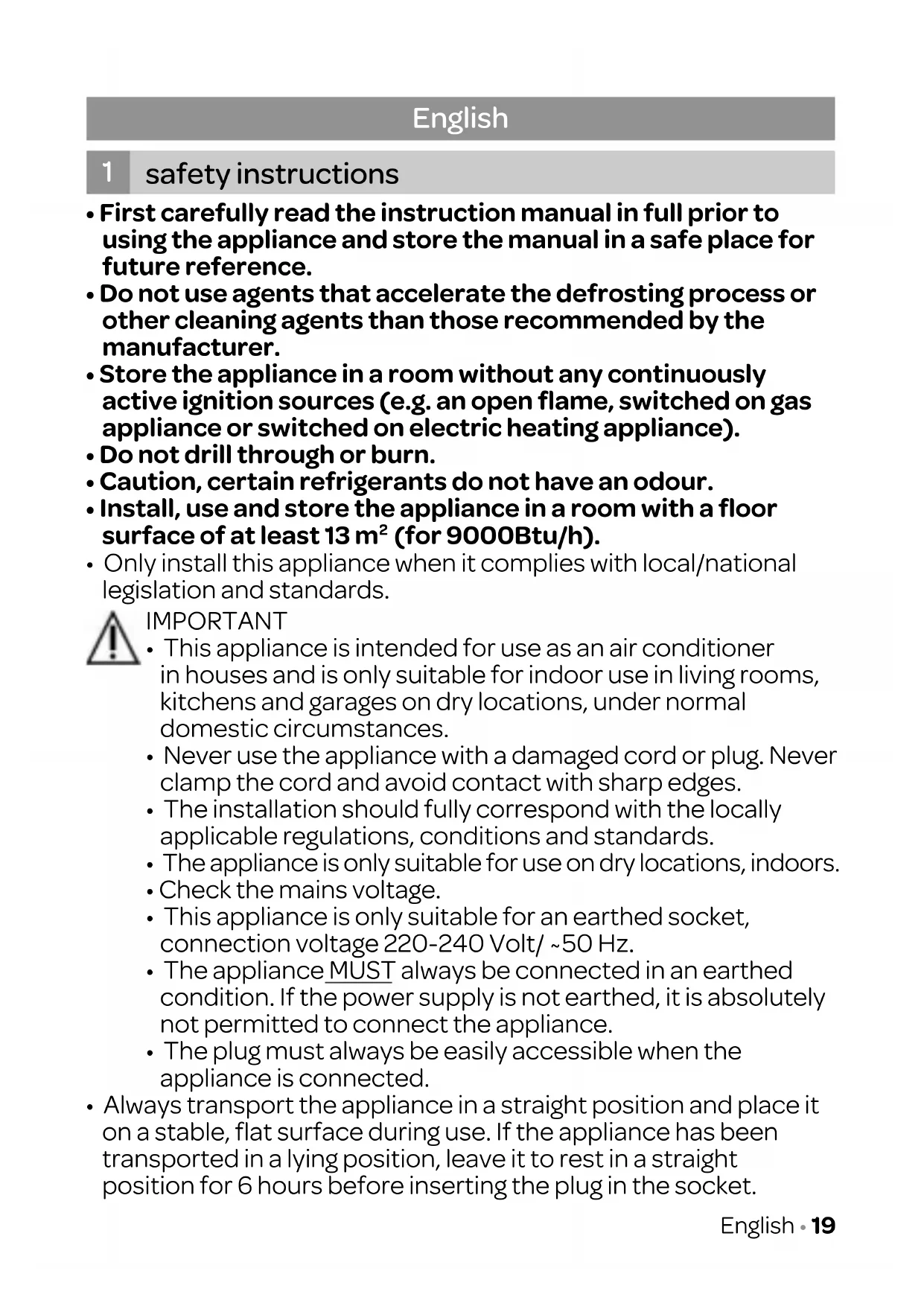 - The appliance must be installed, used and stored in a room with a floor area of more than 13 m