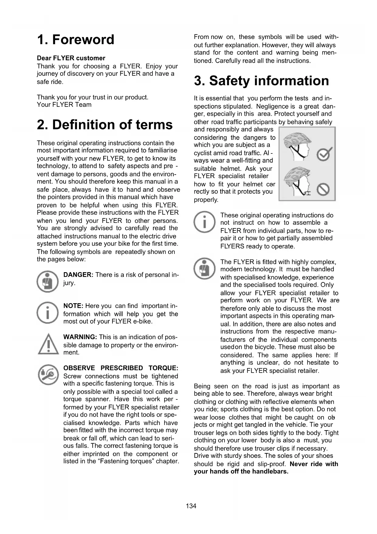 vent damage to persons, goods and the environ- ment. You should therefore keep this manual in a safe place, always have it to hand and observe the pointers provided in this manual which have proven to be helpful when using this FLYER. Please provide these instructions with the FLYER when you lend your FLYER to other persons. You are strongly advised to carefully read the attached instructions manual to the electric drive system before you use your bike for the rst time. The following symbols are repeatedly shown on the pages below: