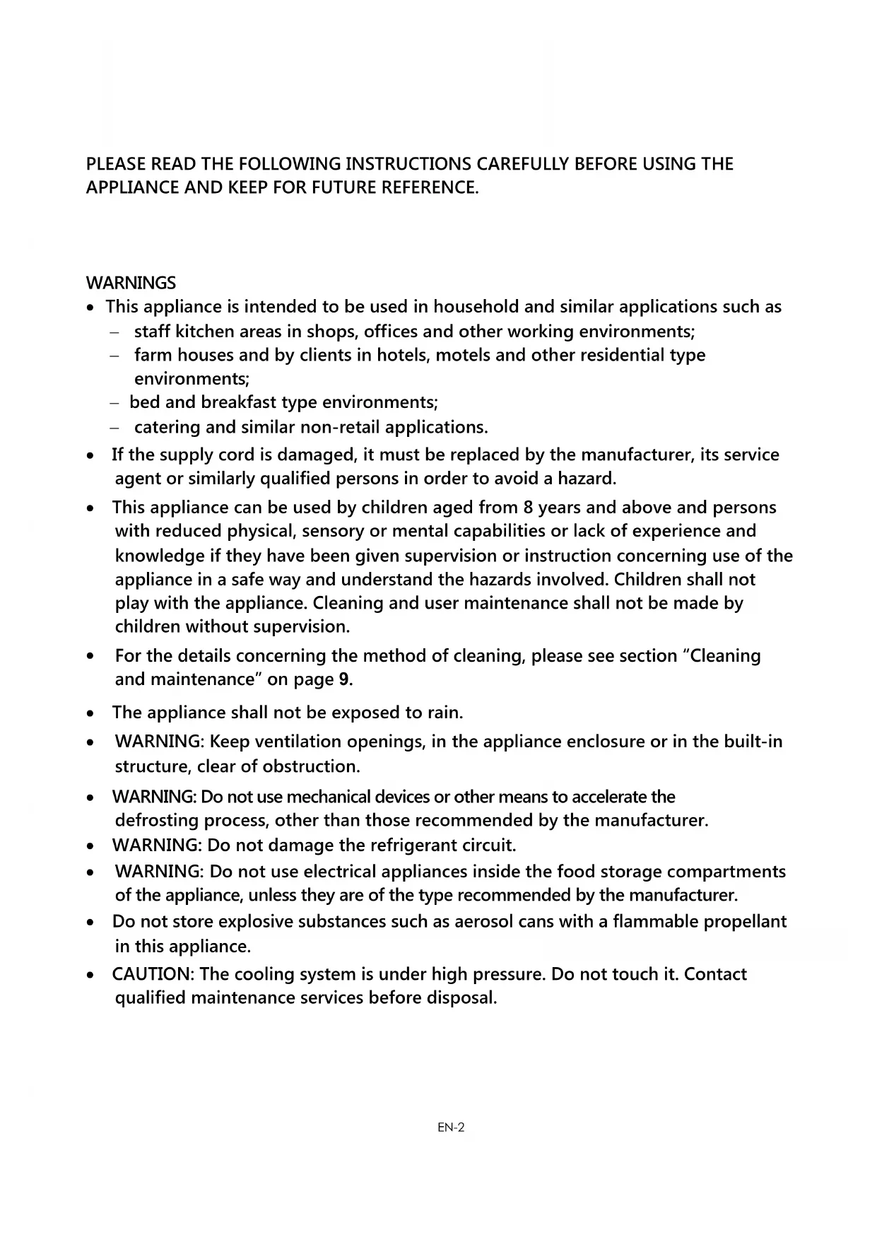 - INSTALLATION: DO NOT INSTALL THIS APPLIANCE IN AREAS THAT ARE TOO HUMID OR TOO COLD, SUCH AS THE OUTBUILDINGS, GARAGES OR WINE CELLARS.