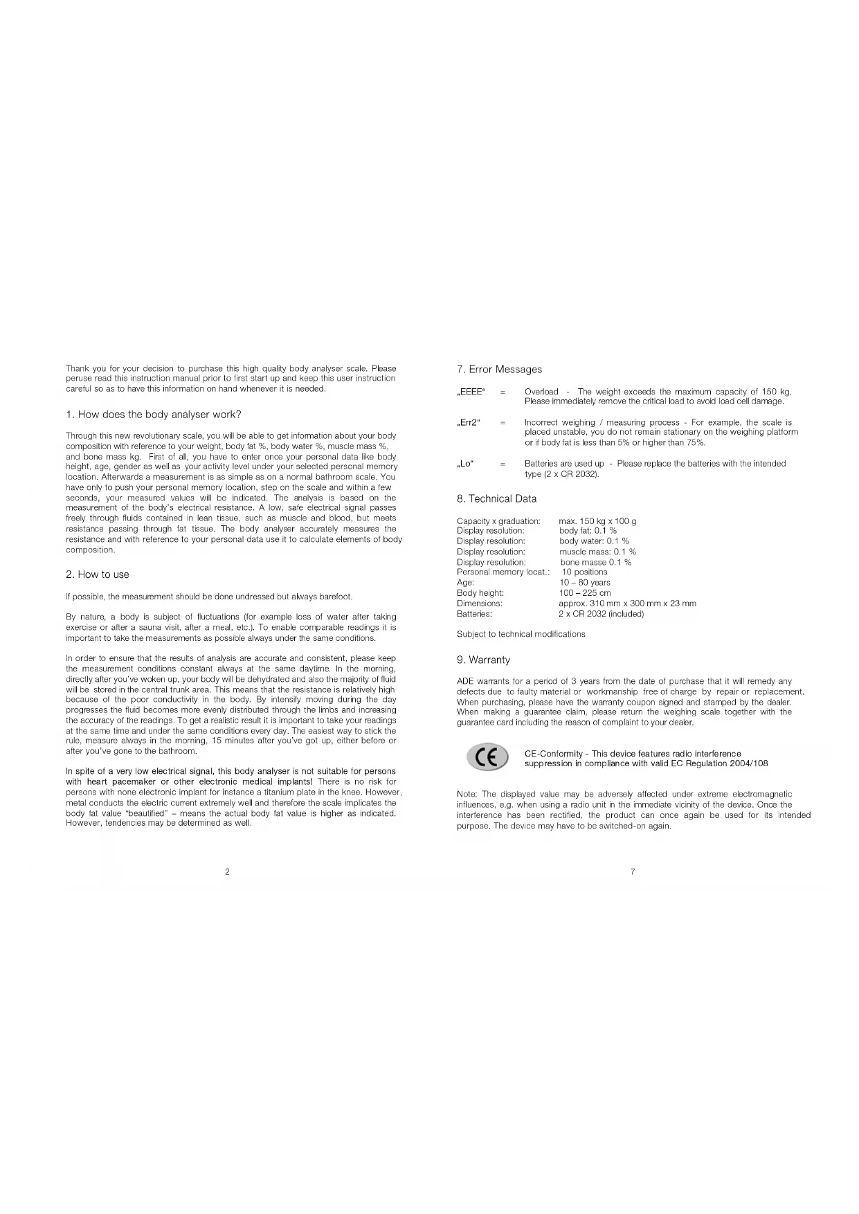 ADE warrants for a period of 3 years from the date of purchase that it will remedy any defects due to faulty material or workmanship free of charge by repair or replacement. When purchasing, please have the warranty coupon signed and stamped by the dealer. When making a guarantee claim, please return the weighing scale together with the guarantee card including the reason of complaint to your dealer.