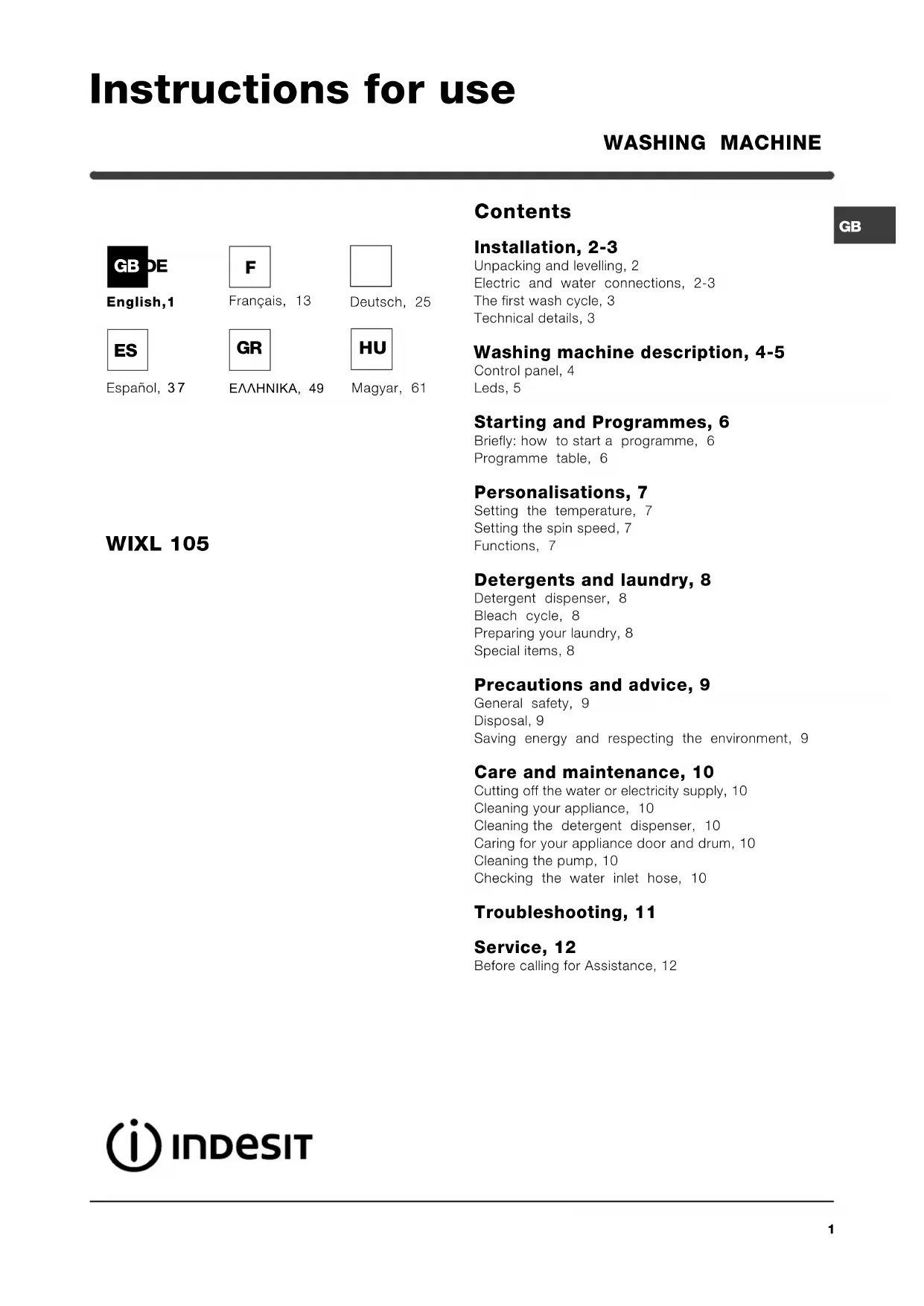 Contents Installation, 2-3 Unpacking and levelling, 2 Electric and water connections, 2-3 The first wash cycle, 3 Technical details, 3 Washing machine description, 4-5 Control panel, 4 Leds, 5 Starting and Programmes, 6 Briefly: how to start a programme, 6 Programme table, 6 Personalisations, 7 Setting the temperature, 7 Setting the spin speed, 7 Functions, 7 Detergents and laundry, 8 Detergent dispenser, 8 Bleach cycle, 8 Preparing your laundry, 8 Special items, 8 Precautions and advice, 9 General safety, 9 Disposal, 9 Saving energy and respecting the environment, 9 Care and maintenance, 10 Cutting off the water or electricity supply, 10 Cleaning your appliance, 10 Cleaning the detergent dispenser, 10 Caring for your appliance door and drum, 10 Cleaning the pump, 10 Checking the water inlet hose, 10 Troubleshooting, 11 Service, 12 Before calling for Assistance, 12 WASHING MACHINE WIXL 105 Instructions for use GB DE