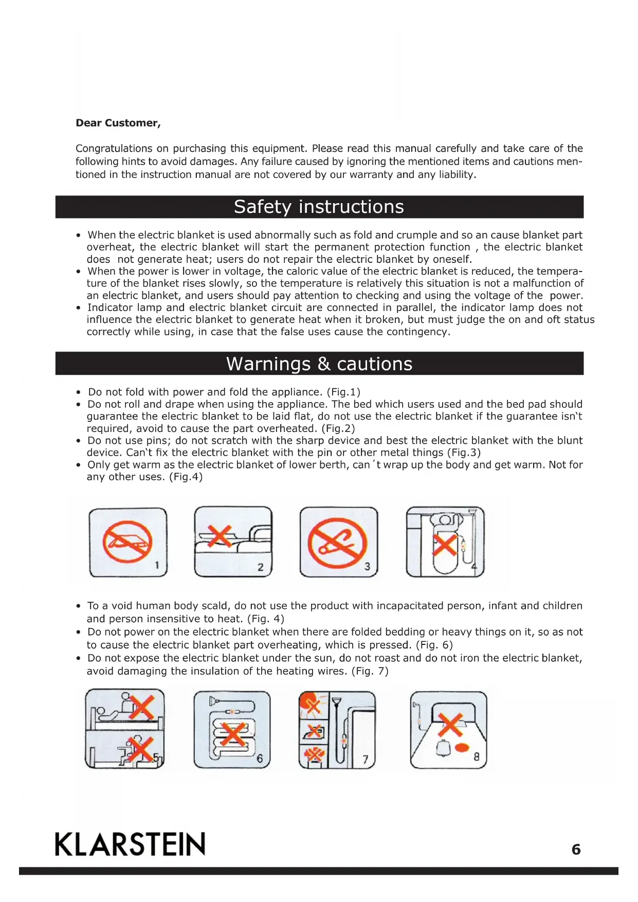 - Do not expose the electric blanket under the sun, do not roast and do not iron the electric blanket, avoid damaging the insulation of the heating wires. (Fig. 7) 6• Do not use together with other heat appliances (such as foot warmer, hot-water bottle), do not heat other heat appliances. (Fig. 8)