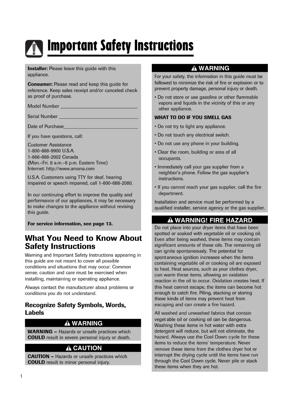 aping and c an create a fire hazard. All washed and unwashed fabrics that contain veget able oil or cooking oil c an be dangerous. Washing these items in hot water with extra detergent will reduce, but will not eliminate, the hazard. Always use the Cool Down c ycle for these items to reduce the items’ temperature. Never remove the se items from the clothe s dryer hot or interrupt the drying c ycle until the items have run through the Cool Down cycle. Never pile or stack these items when they are hot. Installer: Please leave this guide with this appliance. Consumer: Please read and keep this guide for reference. Keep sales receipt and/or canceled check as proof of purchase. Model Number _______________________________ Serial Number ________________________________ Date of Purchase______________________________ If you have questions, call: Customer Assistance 1-800-688-9900 U.S.A. 1-866-688-2002 Canada (Mon.–Fri. 8 a.m.–8 p.m. Eastern Time) Internet: http://www.amana.com U.S.A. Customers using TTY for deaf, hearing impaired or speech impaired, call 1-8 00-688-2080. In our continuing effort to improve the quality and performance of our appliances, it may be necessary to make changes to the appliance without revising this guide. For service information, see page 13.2